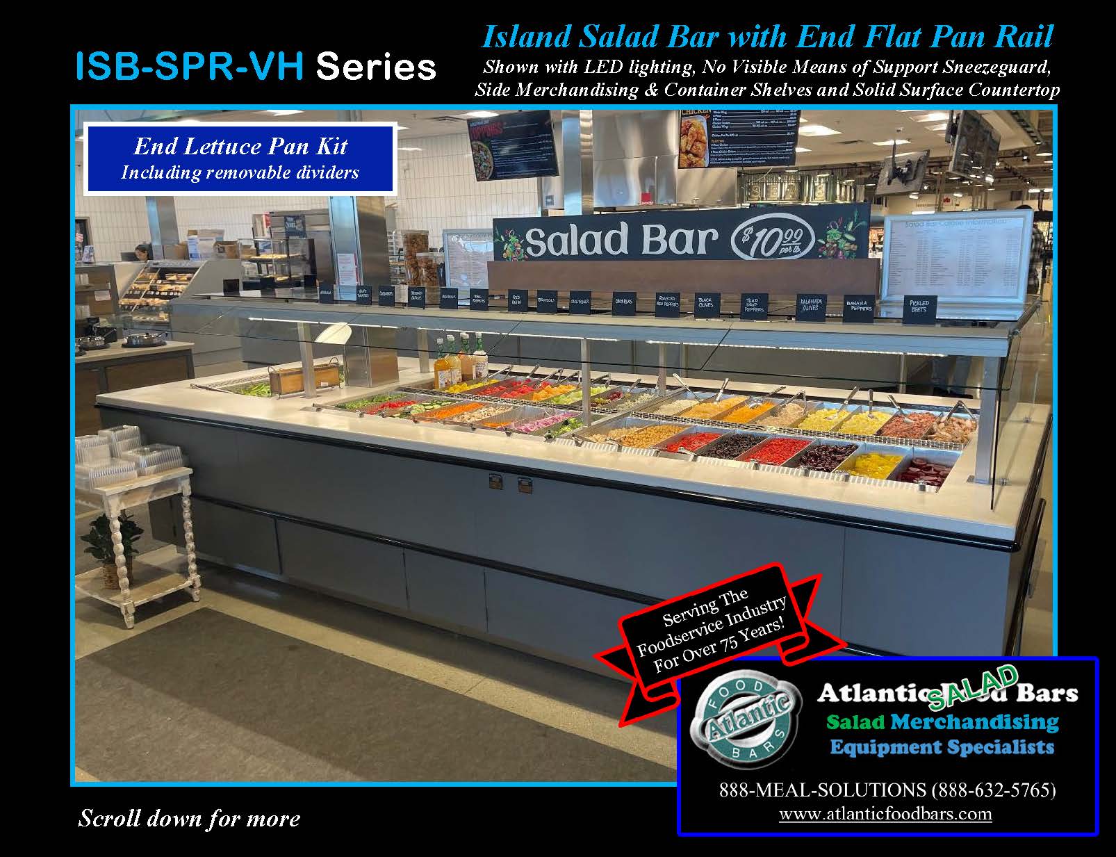 Atlantic Food Bars introduced salad bars to the supermarket industry almost 50 years ago and has been the industry leader ever since. With unlimited ways to customize an island food bar, you can incorporate soup, olives, hot food, refrigerated entrees, packaged food and more, all in one easily shop-able footprint for your customers. We can even build to wrap a store column – turning wasted space into merchandising space. The salad bar displayed above features our end lettuce pan kit with removable lexan dividers and custom pans, allowing for more customization for your perfect island merchandiser.