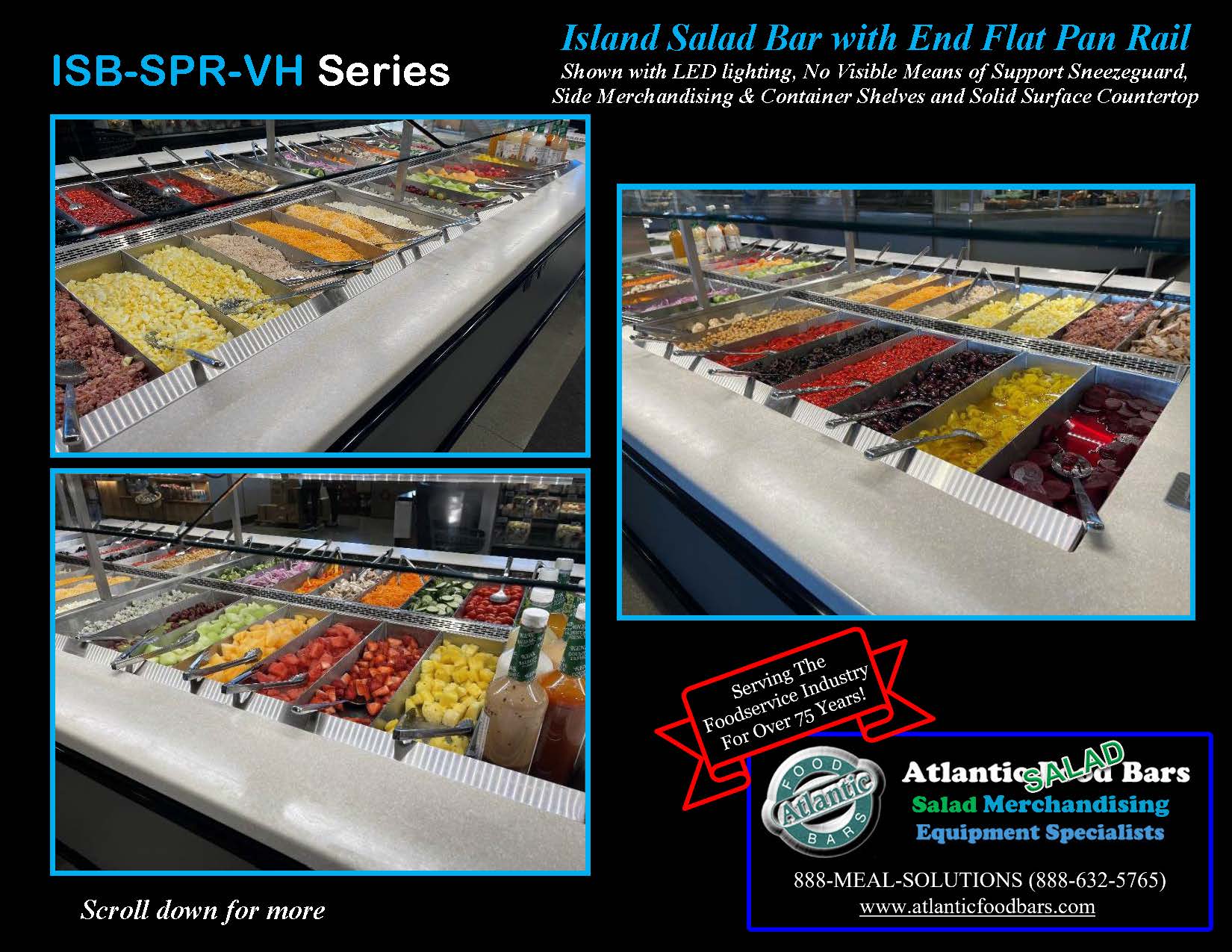 The Atlantic Food Bars ISB Series starts with a basic footprint – you select the size, and we will design a salad or olive bar based upon our innovative refrigeration system that GUARANTEES temperature maintenance, and keeps your food looking fresh and inviting. Our base model includes NSF7 airflow refrigeration system to keep health departments happy, built in container shelf in the body to maximize merchandising in your floor space, and tubular sneezeguard design with flip up glass for ease of cleaning and loading. Add hot wells, a soup station, or upgrade the base model with options such as an end container and condiment station or our exclusive “No-Visible-Means-Of-Support” Sneezeguard, which offers optimal visibility and convenience – the glass stays up in the position in which you let go. This sneezeguard includes scratch resistant tempered glass with polished edges on the ends, top and sneeze shield. Salad dressing template option keeps your dressing bottles organized and neat. Heavy-duty custom stainless steel food pans are barely visible and keep the focus where it should be – on your food – with options including flange-free design, finger tabs for easy removal and NSF radius corners.