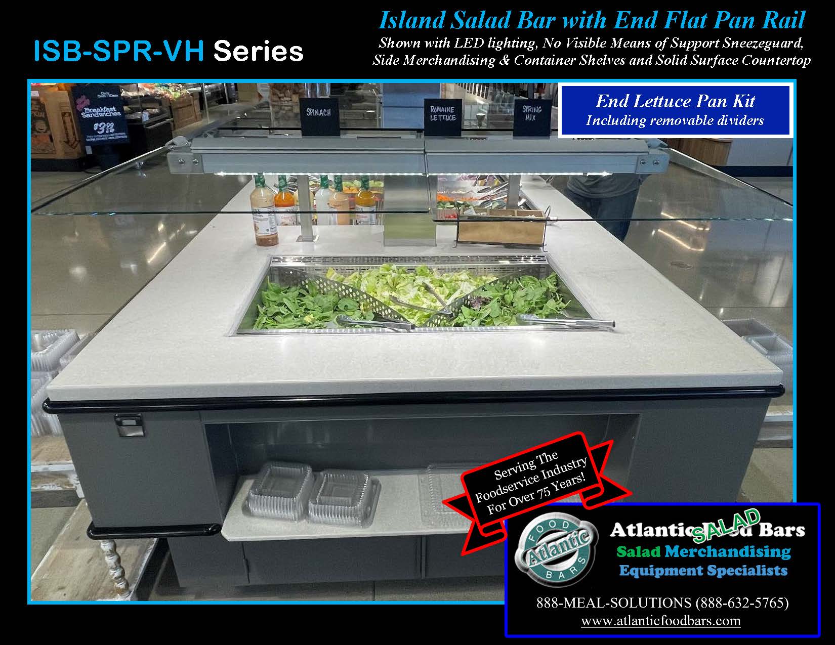 13′ Refrigerated Island Salad Bar with LED Lighting, “No Visible Means of Support” Sneezeguard, Side Merchandising & Container Shelves, Solid Surface Countertop and End Lettuce Pan Kit – ISB Series