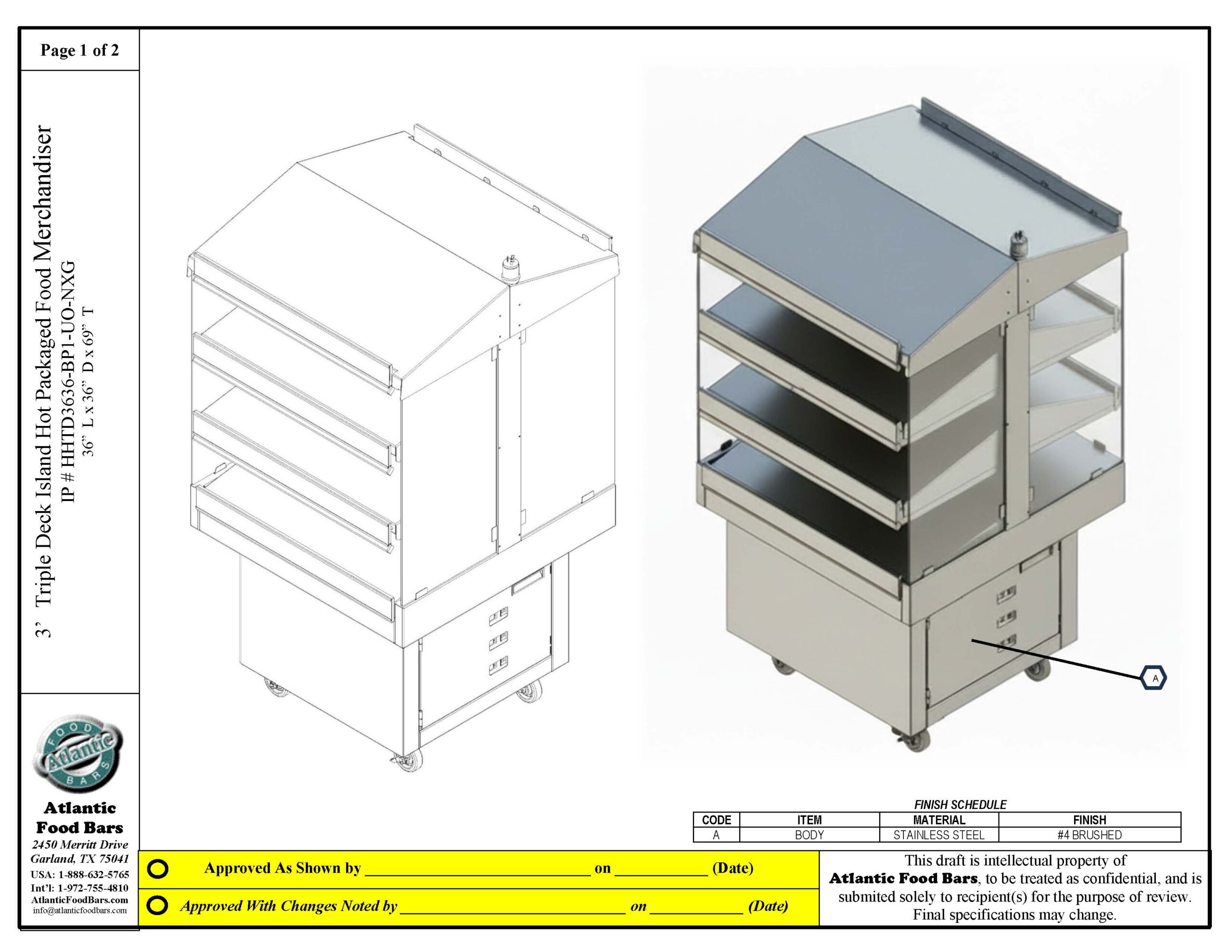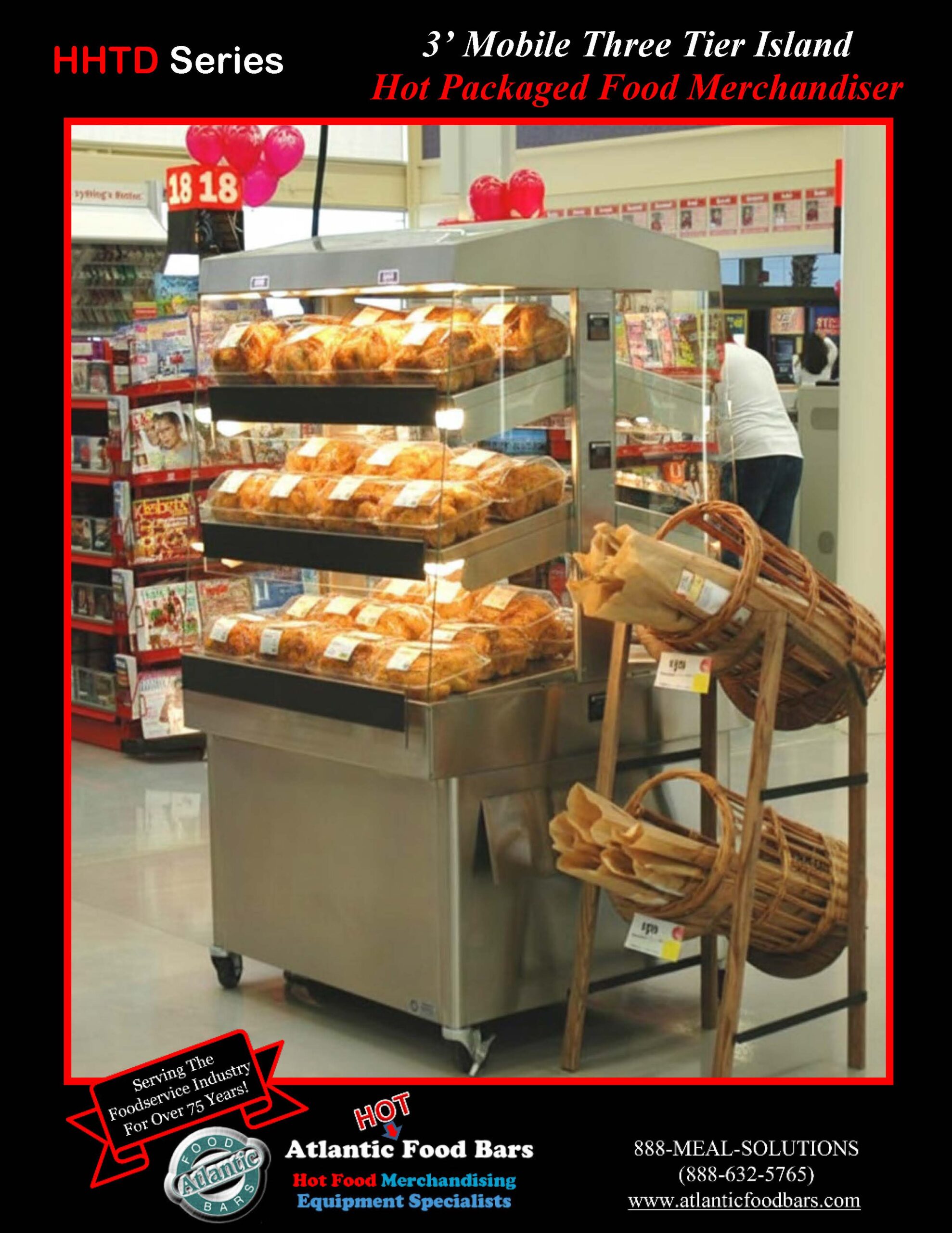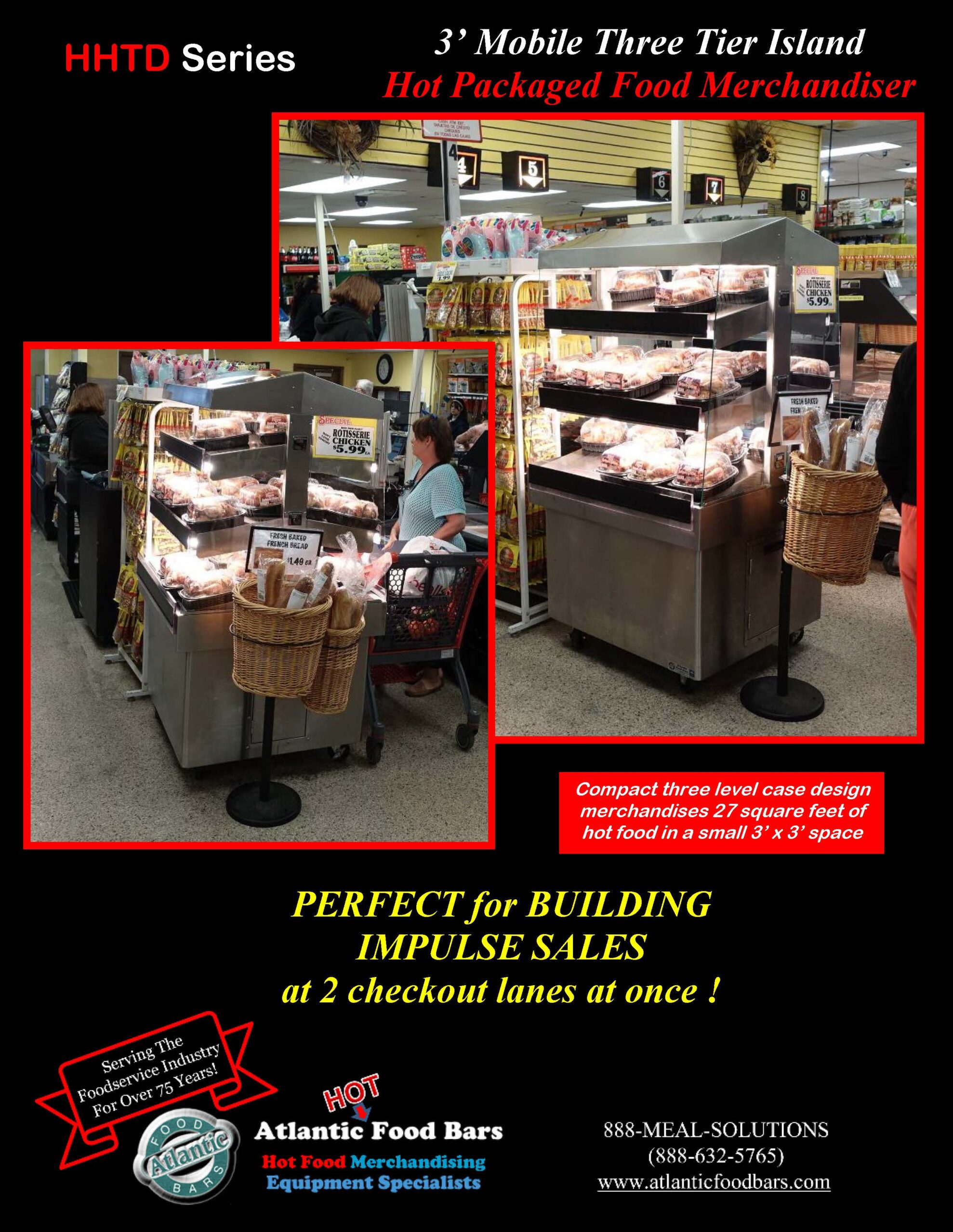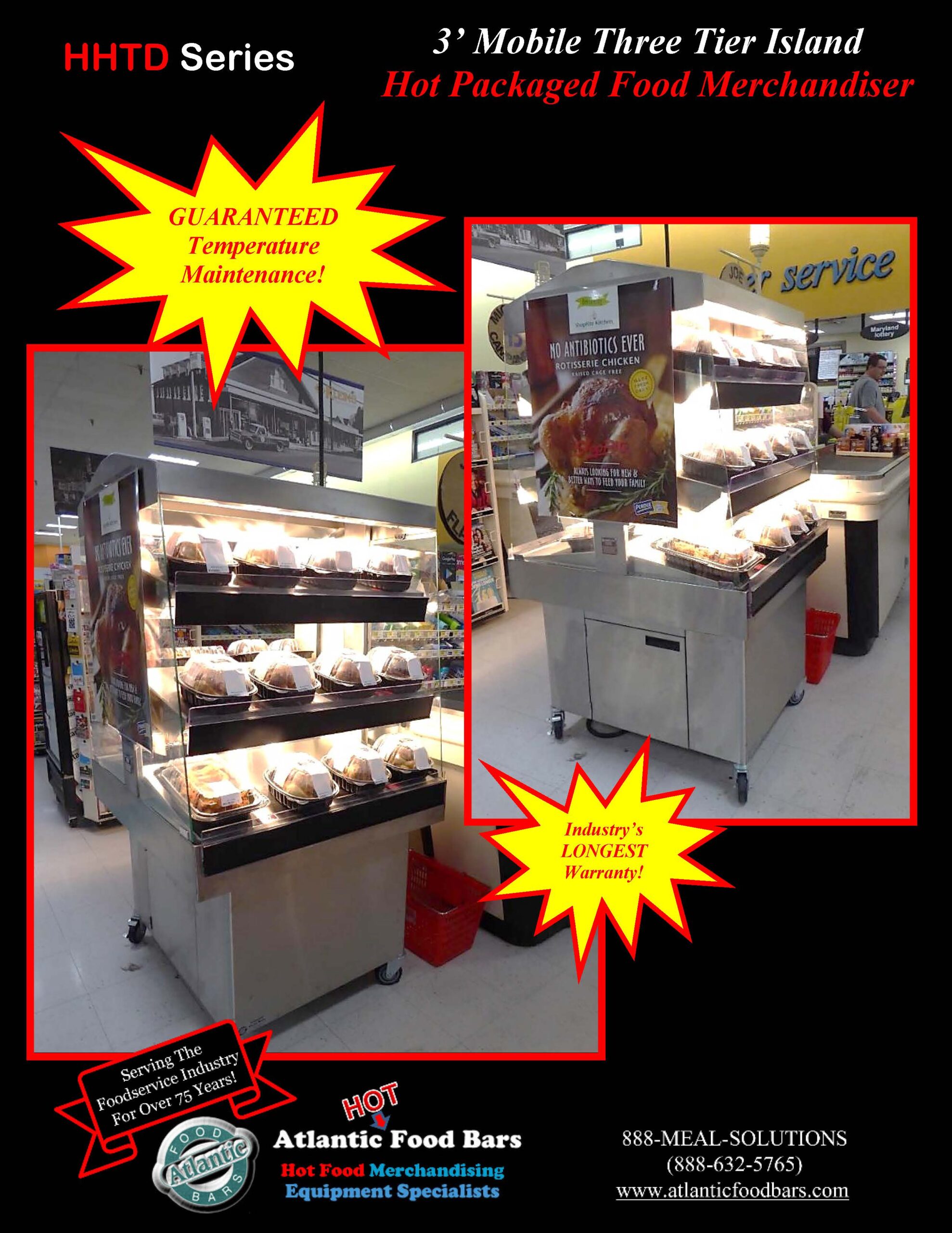 The Atlantic Food Bars HHTD Series mobile hot chicken display case’s triple deck design offers additional capacity for cross merchandising opportunities with guaranteed temperature maintenance. Create more impulse sales, and grow your hot food program in a compact footprint! Based upon hourly and daily traffic patterns, you can utilize lighting controls and infinite top and bottom temperature controls for each individual hot deck, controlling shrink, while maximizing merchandising impact. This double-sided case is ideal, not just for rotisserie chicken, but for all packaged foods – turn off the heat during slow periods to merchandise dry goods. If you are selling hot food full service, you won’t believe the profitability of this self service unit due to reduced labor costs, convenience for shoppers, higher sales and lower shrink. Arrives fully assembled – unwrap, plug in and start selling! Available in one, two or three levels of hot food merchandising.