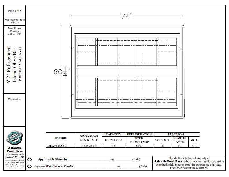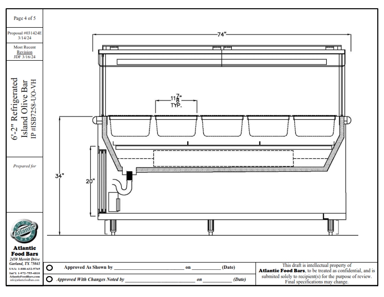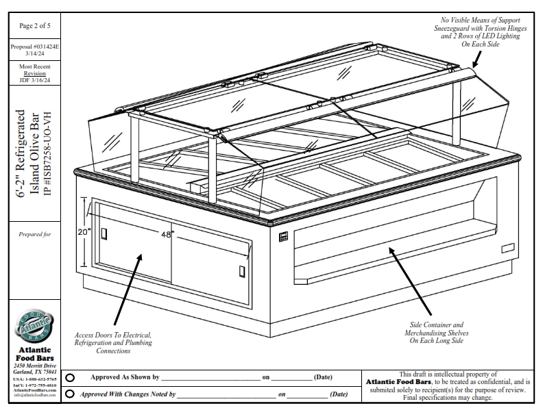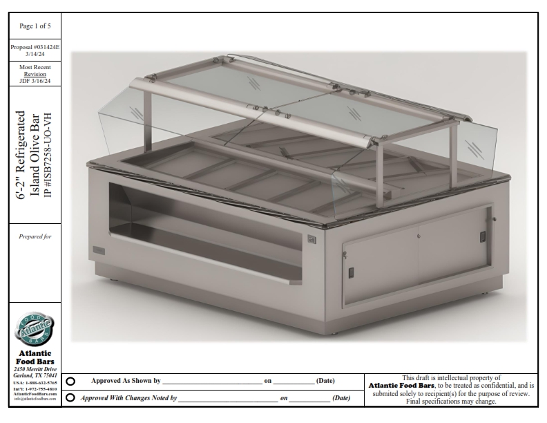 Atlantic Food Bars introduced olive bars to the supermarket industry almost 50 years ago and has been the industry leader ever since. With unlimited ways to customize an island food bar, you can incorporate soup, salad, hot food, refrigerated entrees, packaged food and more, all in one easily shop-able footprint for your customers. We can even build to wrap a store column – turning wasted space into merchandising space. The Atlantic Food Bars ISB Series starts with a basic footprint – you select the size, and we will design a salad bar based upon our innovative refrigeration system that GUARANTEES temperature maintenance, and keeps your food looking fresh and inviting. Our base model includes NSF7 airflow refrigeration system to keep health departments happy, built in container shelf in the body to maximize merchandising in your floor space, and tubular sneezeguard design with flip up glass for ease of cleaning and loading. Add hot wells, a soup station, or upgrade the base model with options such as an end container and condiment station or our exclusive “No-Visible-Means-Of-Support” Sneezeguard, which offers optimal visibility and convenience – the glass stays up in the position in which you let go. This sneezeguard includes scratch resistant tempered glass with polished edges on the ends, top and sneeze shield. Salad dressing template option keeps your dressing bottles organized and neat. Heavy-duty custom stainless steel food pans are barely visible and keep the focus where it should be – on your food – with options including flange-free design, finger tabs for easy removal and NSF radius corners.