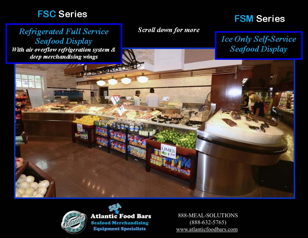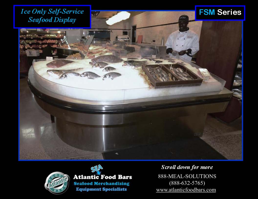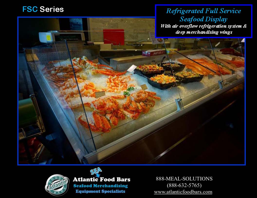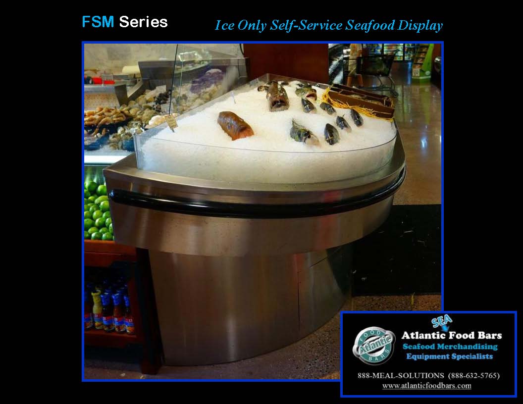 Angled Refrigerated Fresh Seafood Merchandiser with Deep Merchandising Wings and Custom Ice-Only Self-Service Curve – FSC14461 and FSM
