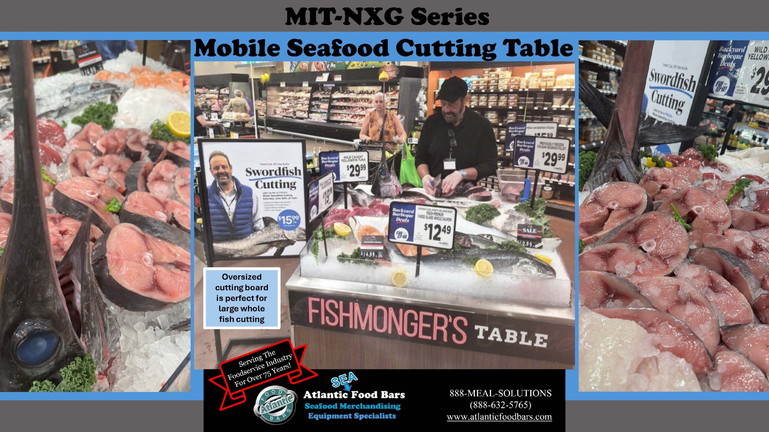 Fishmonger’s Road Show – Mobile Ice Tables for Self or Full Service Merchandising with Flip Down Fish Cutting and Fileting Board – MIT-M Series Sell fresh iced seafood, bagged clams,...