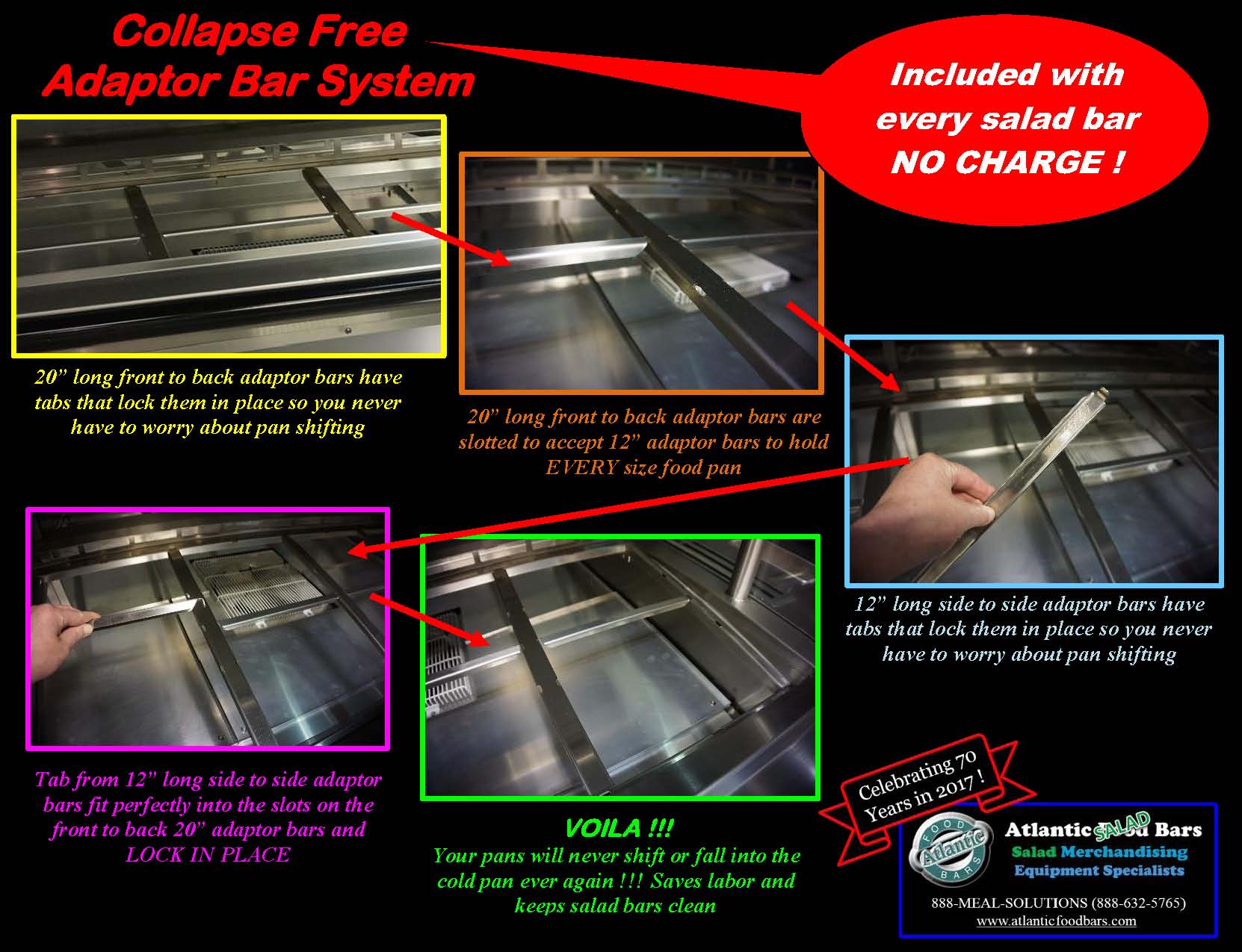 Collapse-Free Adaptor Bar System – Your Food Pans Will Never Shift or Fall Ever Again – Included with Every Salad Bar at No Charge!