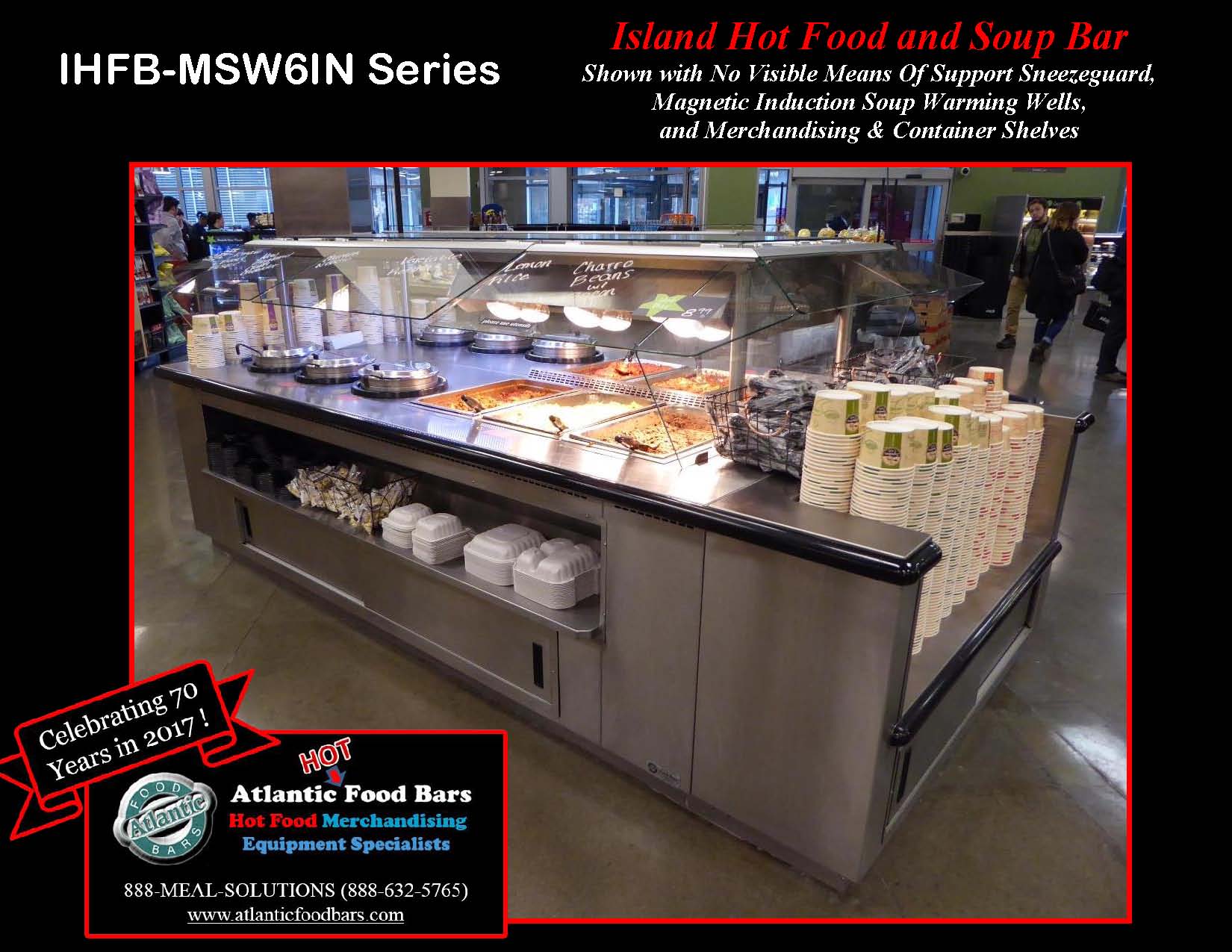 Combination Island Merchandiser – Hot Food and Soup Bar with Floating Glass Sneezeguard and End Container Shelf – IHFB-MSW6IN-VH Series