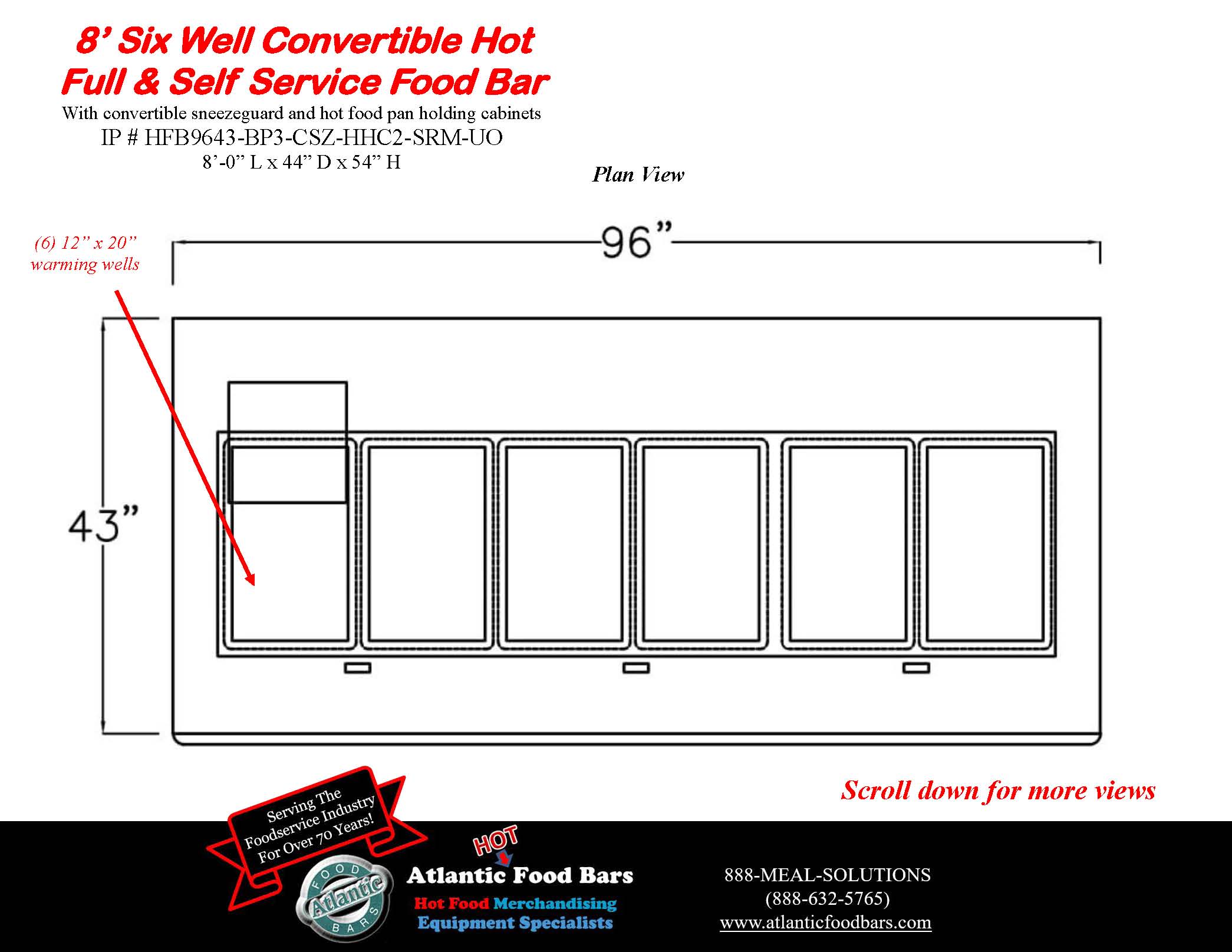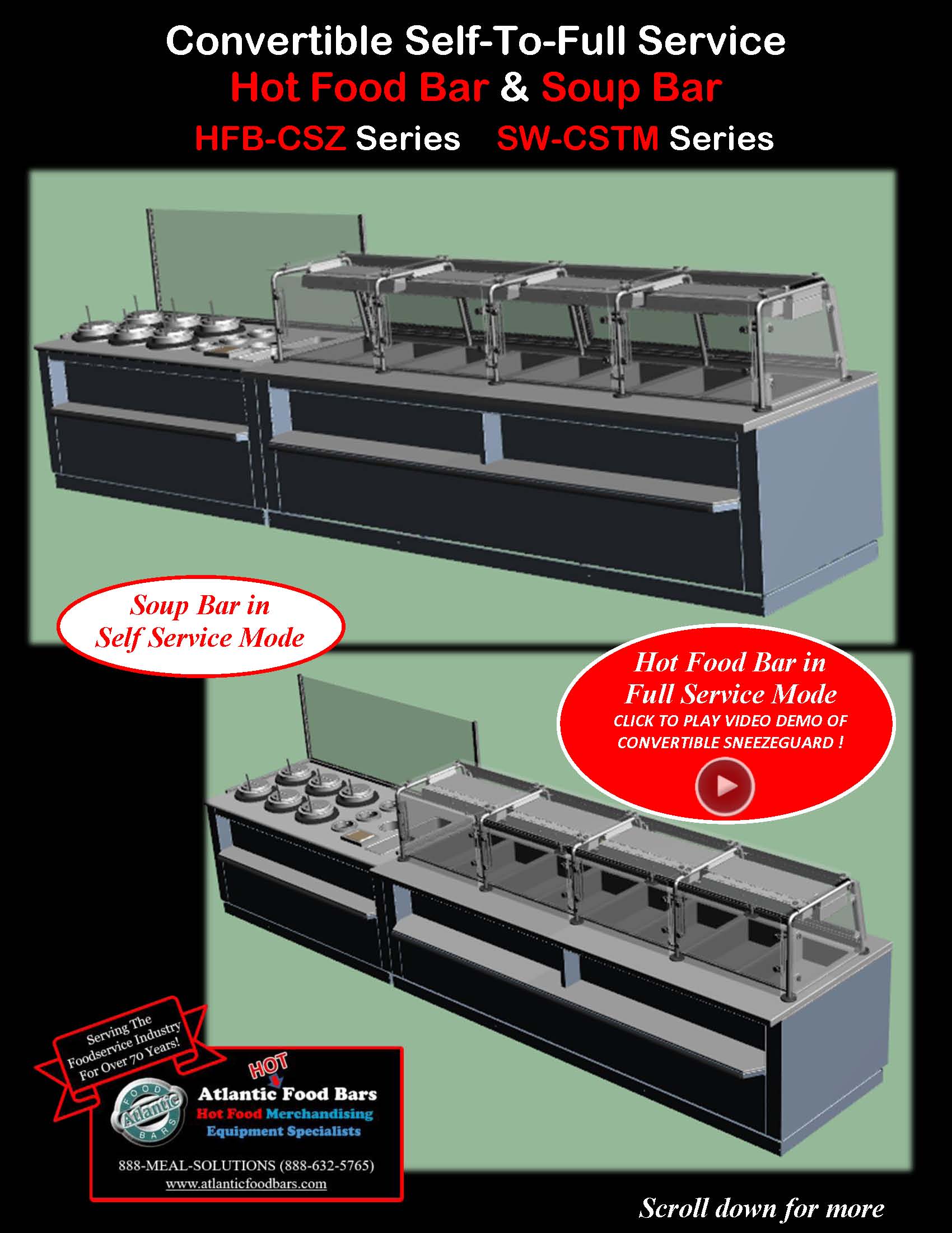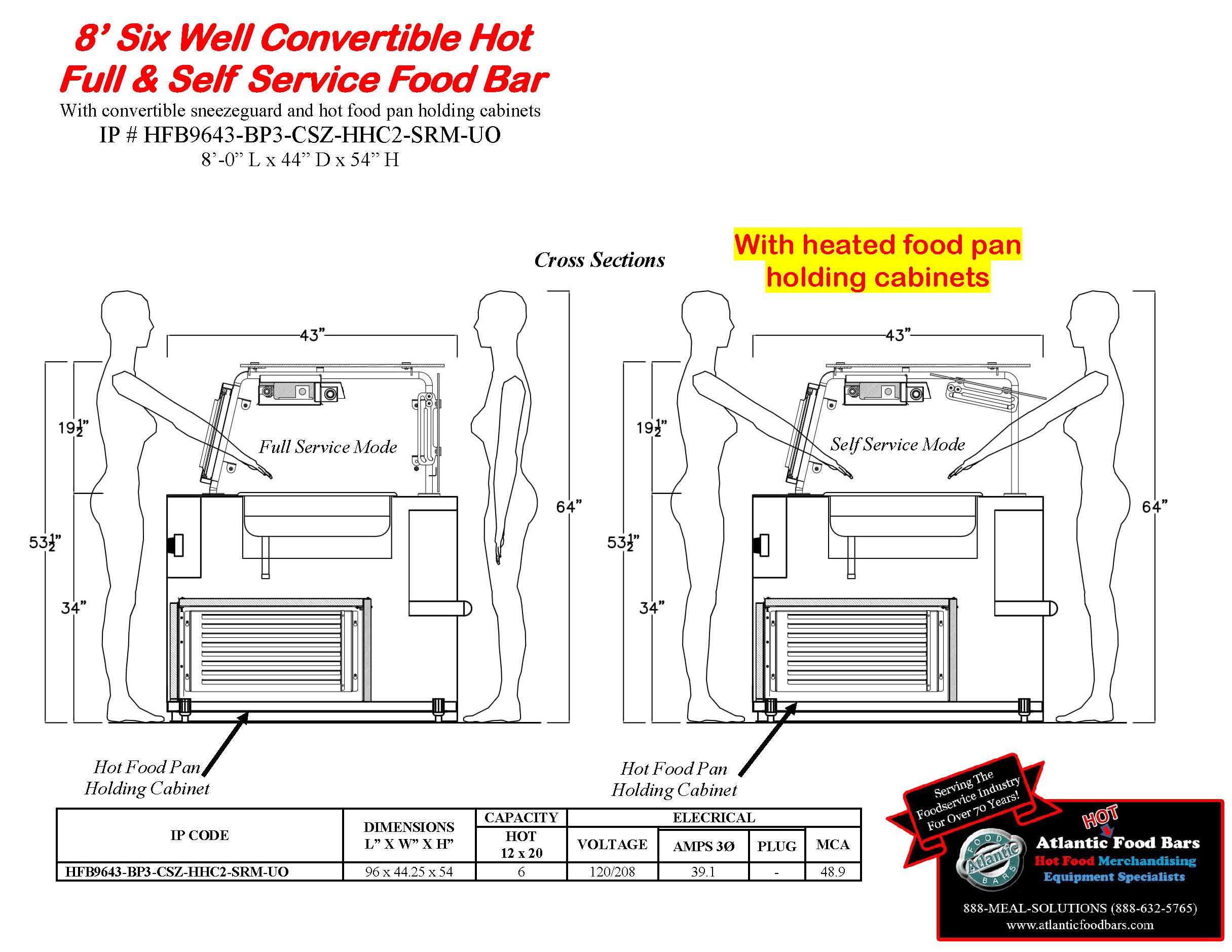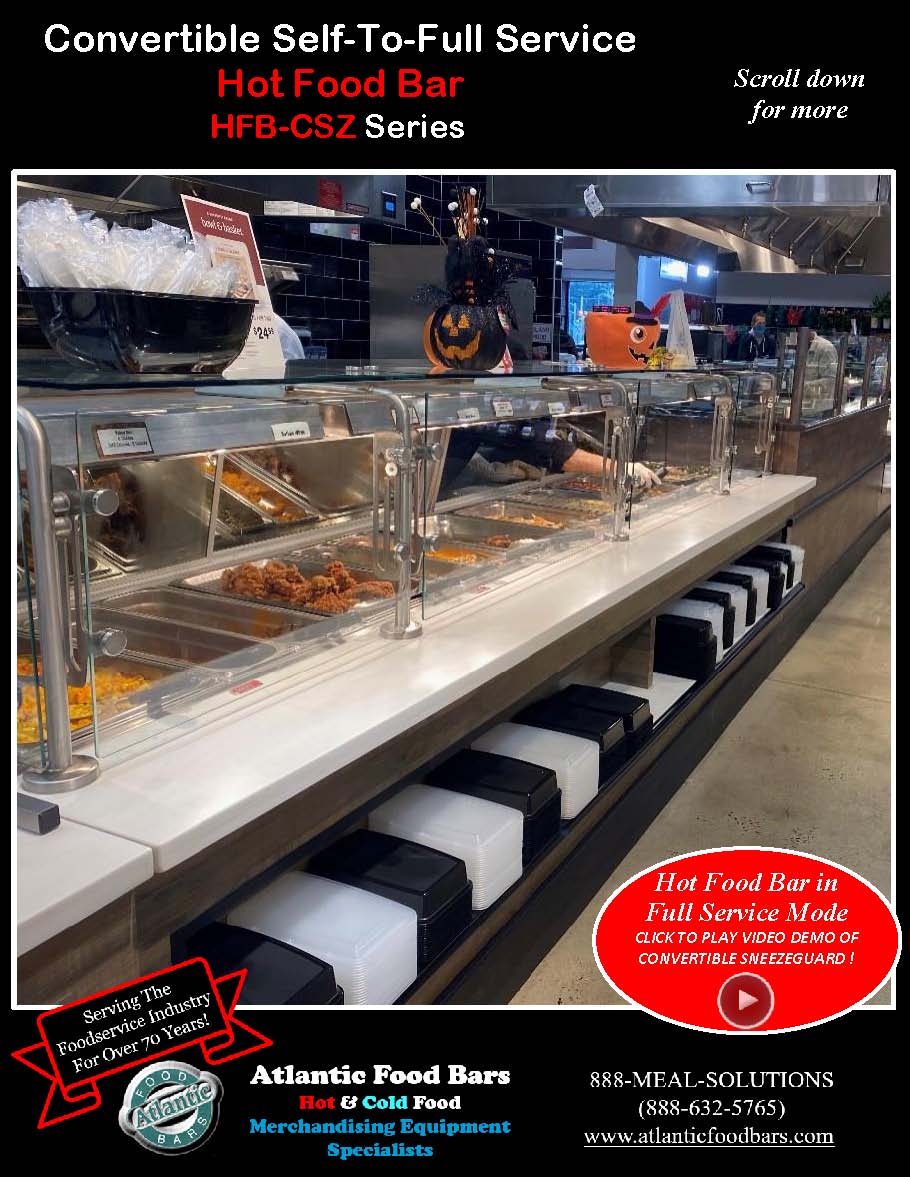 Atlantic Food Bars has the broadest offering of standard and custom self-service in-line and end cap hot food bars – you tell us the size, and we either have a standard model to meet your needs or we will design a hot food bar, to your desired length (to within 1/16”). Custom sizes are no problem! The Atlantic Food Bars HFB-CSZ Series Convertible Service Hot Food Bar allows you to easily switch from self to full service merchandising as desired – no tools required! The glass canopy and convertible sneezeguard are made with scratch resistant tempered glass, and the sneezeguard easily slides under the top for self-service mode. Only Atlantic GUARANTEES temperature maintenance, and our hot food bars keep your food looking fresh and inviting.