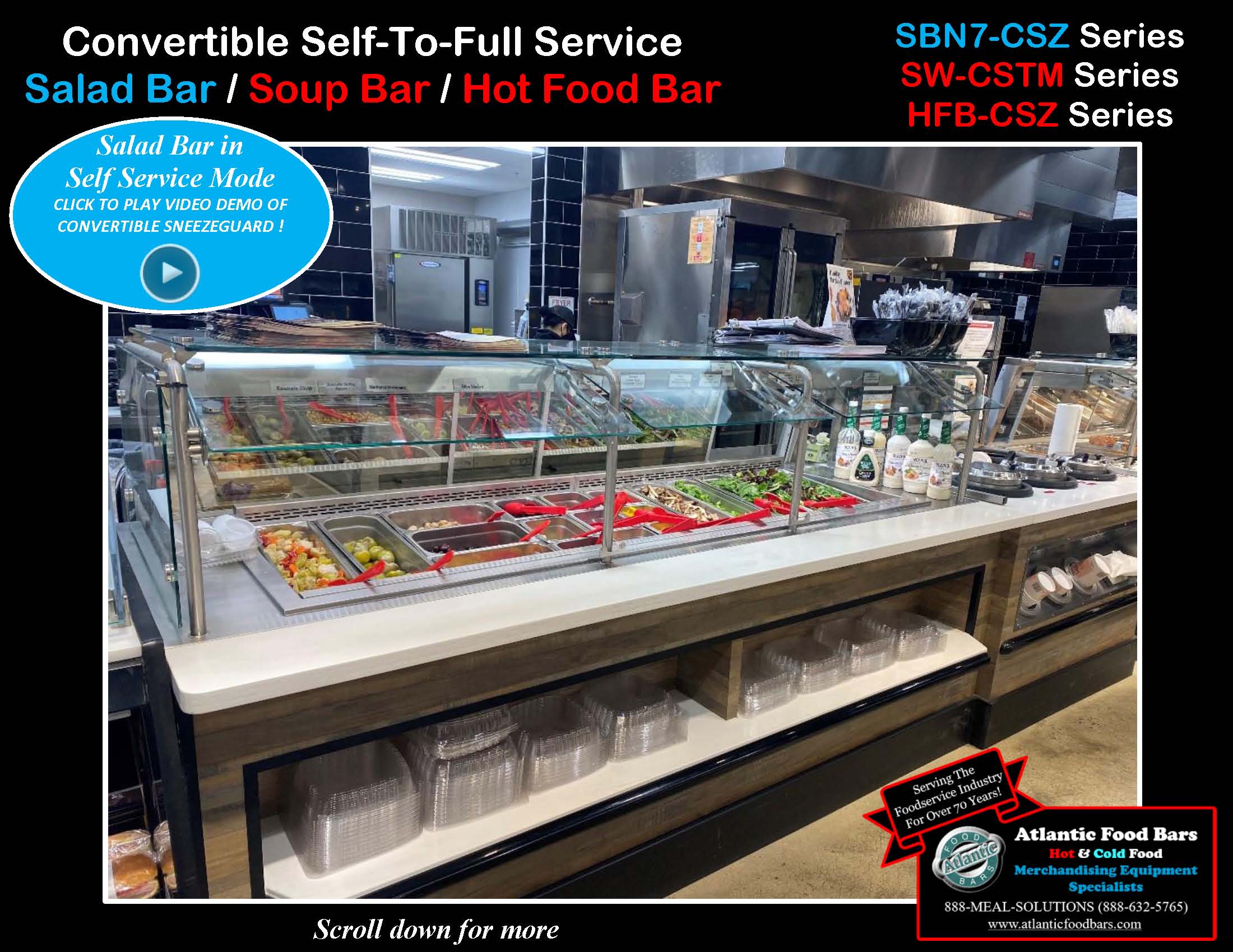 The Atlantic Food Bars SBN7-CSZ Series Convertible Service Refrigerated Salad Bar allows you to easily switch from self to full service merchandising as desired, by hand, in seconds! The sneezeguard easily slides under the top for self-service mode. Featuring our super cold remote NSF7 air overflow design refrigeration system, our SBN7-CSZ Series keeps food fresh and health departments happy. Order with self-contained refrigeration to make it a simple plug & play – no contractor needed. Available in lengths from 48” to 16’ long. Brilliant LED interior lighting and mirrored back panel / doors enhance food display, making it visible from 100 feet away. Convenient shelf in body offers organized space for food containers, utensils and cross merchandising opportunities for snack foods. Makes for an enhanced display that attracts your shoppers’ attention and builds impulse sales.