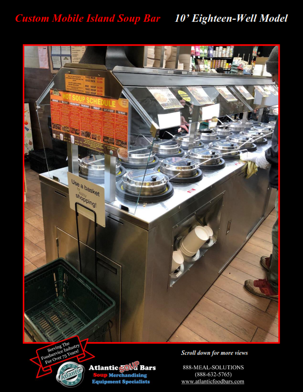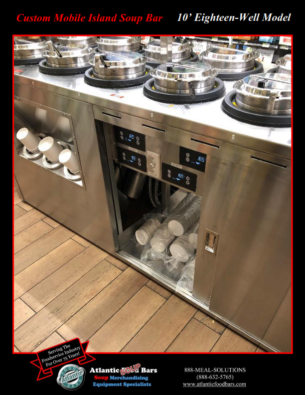 If you can imagine it, we can build it! Atlantic Soup Bars are available in countless standard and custom configurations. Create more impulse sales and grow your food merchandising programs with displays that guarantee temperature maintenance. For over 75 years, we have worked with our customers to create imaginative cross merchandising opportunities and get the most out of a singular footprint. We can even build in two pieces to wrap a structural support column and turn the previously unusable area into additional valuable selling space in your store! Don’t clutter your selling space with temporary cardboard displays to hide a column – maximize your merchandising impact with a custom shop-around case designed to your exact specs. If you are selling food full service, you won’t believe the profitability of these self service units due to reduced labor costs, convenience for shoppers, higher sales and lower shrink.