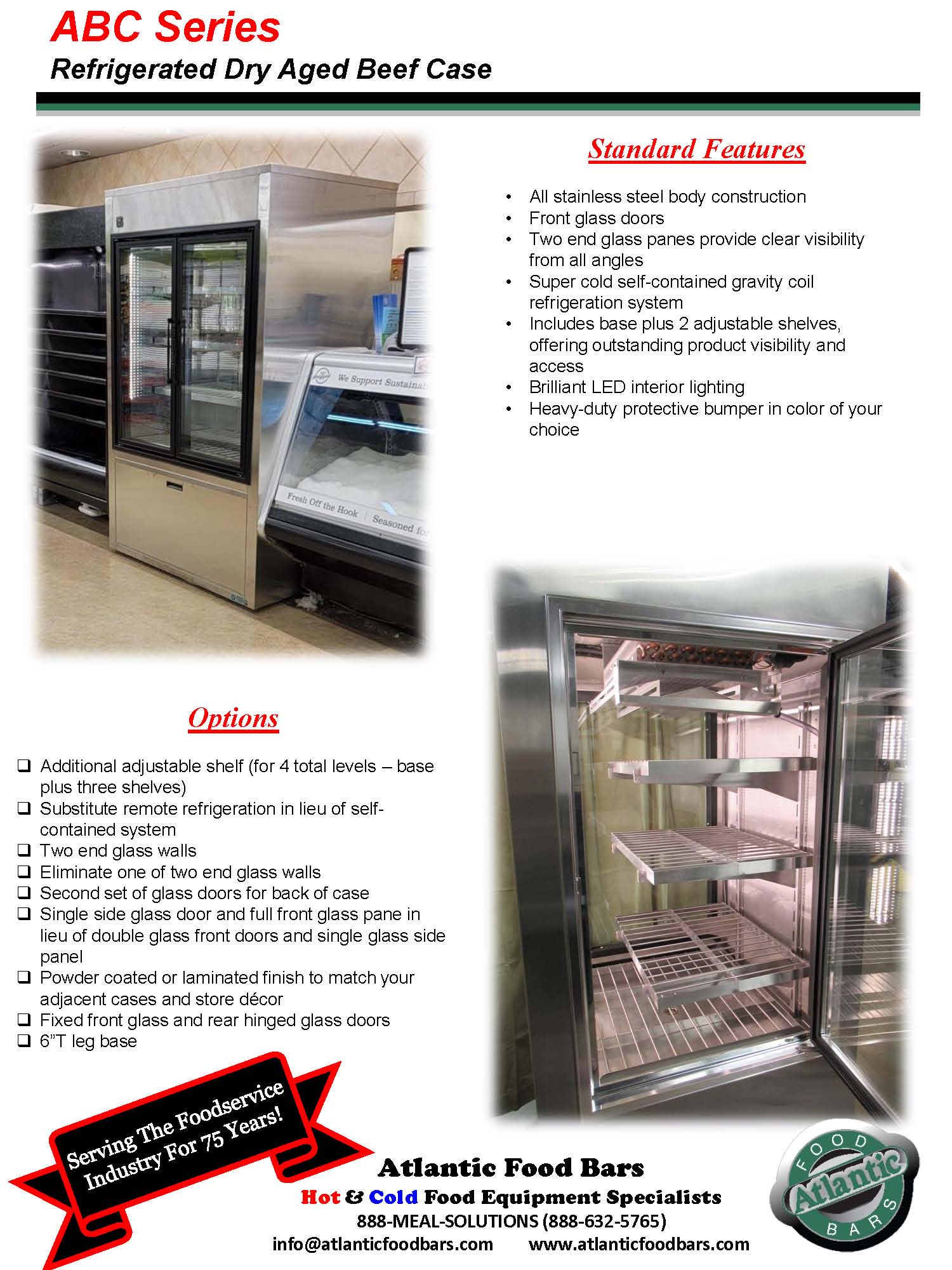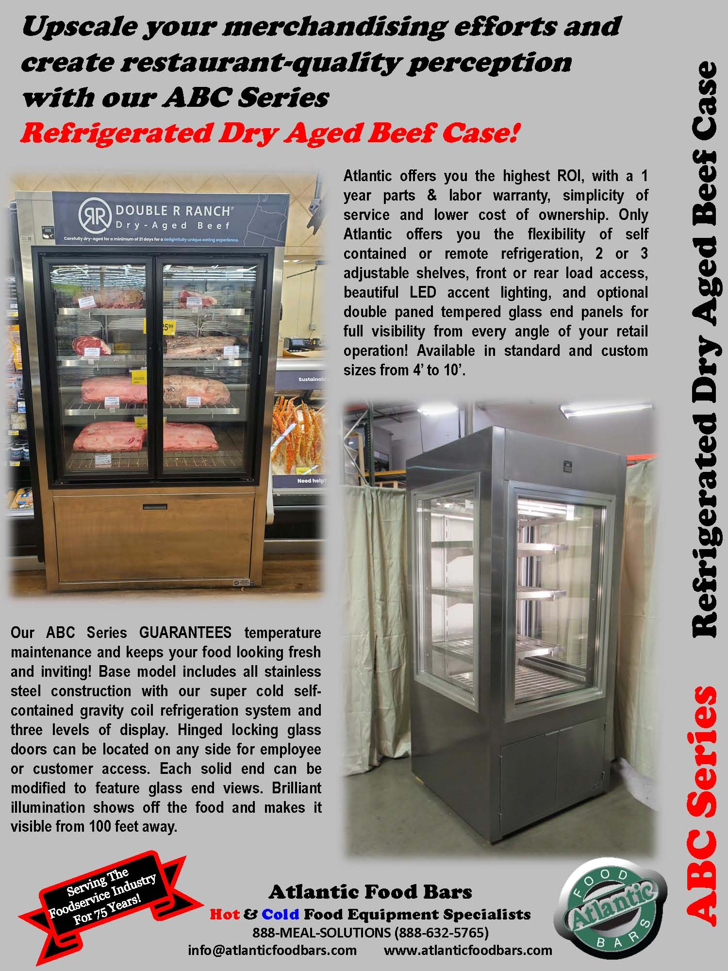 Upscale your merchandising efforts and create restaurant-quality perception with the Atlantic Food Bars ABC Series Refrigerated Dry Aged Beef Case! Atlantic offers you the highest ROI, with a 1 year parts & labor warranty, simplicity of service and lower cost of ownership. Only Atlantic offers the flexibility of self contained or remote refrigeration, 2 or 3 adjustable shelves, front or rear load access, beautiful LED accent lighting visible from 100 feet away, and optional doubled-paned tempered glass end panels for full visibility from every angle of your retail operation.