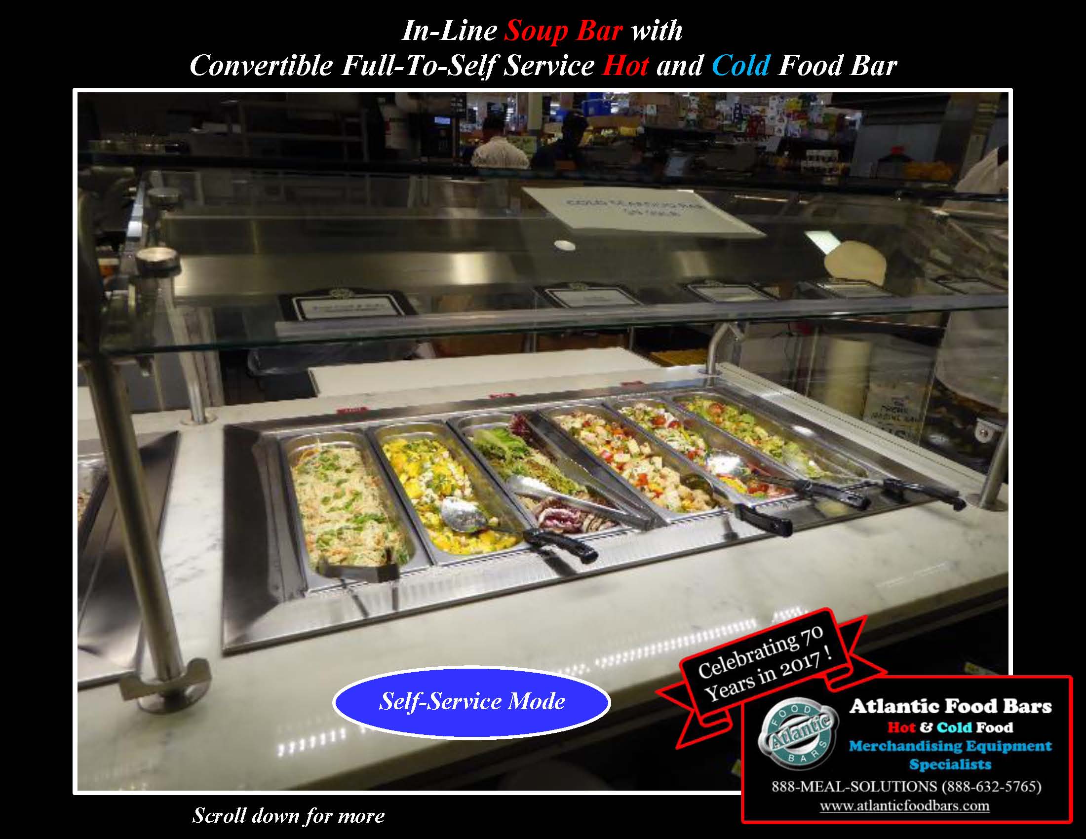 Easily Switch From Full Service To Self Service In Seconds! Custom In-Line Soup Bar with Refrigerated and Hot Bulk Food featuring Convertible Sneezeguard