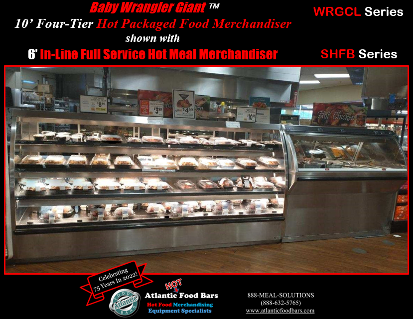 The Atlantic Food Bars WRGCL Series Low Profile Baby Wrangler Giant offers three or four levels of hot chicken and packaged food merchandising. Increase your offering, create more impulse sales, and grow your hot food program. Based upon hourly and daily traffic patterns, you can utilize infinite temperature control for each individual hot deck, controlling shrink, while maximizing merchandising impact. The WRGCL Series is great for end-caps and in-line locations! This multi-level hot grab & go merchandiser is ideal, not just for rotisserie chicken, but for all packaged foods – turn off the heat on any given level to merchandise dry goods. If you are selling hot food FULL service, you won’t believe the profitability of this SELF service unit due to reduced labor costs, convenience for shoppers, higher sales and lower shrink.