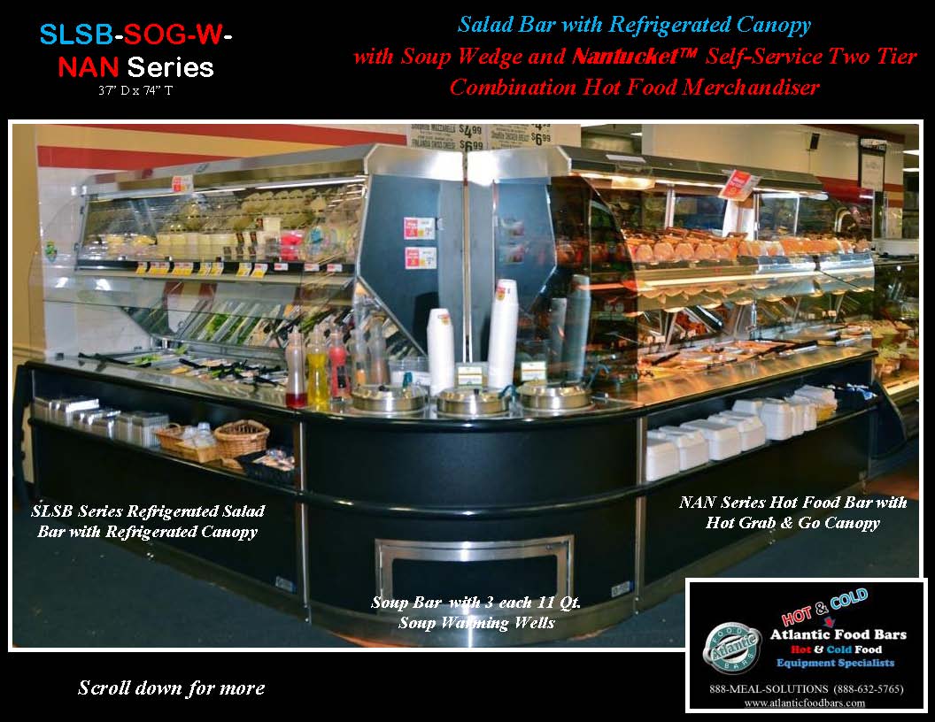 Hot and Cold Self-Service Lineup Doubles Your Merchandising Per Linear Foot – Salad Bar with Refrigerated Canopy, Soup Bar Wedge and Two-Tier Combination Hot Food Merchandiser