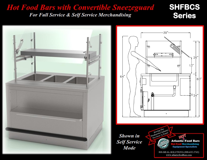 Hot Food Bars with Convertible Sneezeguard for Interchangeable Full Service & Self Service Merchandising – No Tools Required – SHFBCS Series