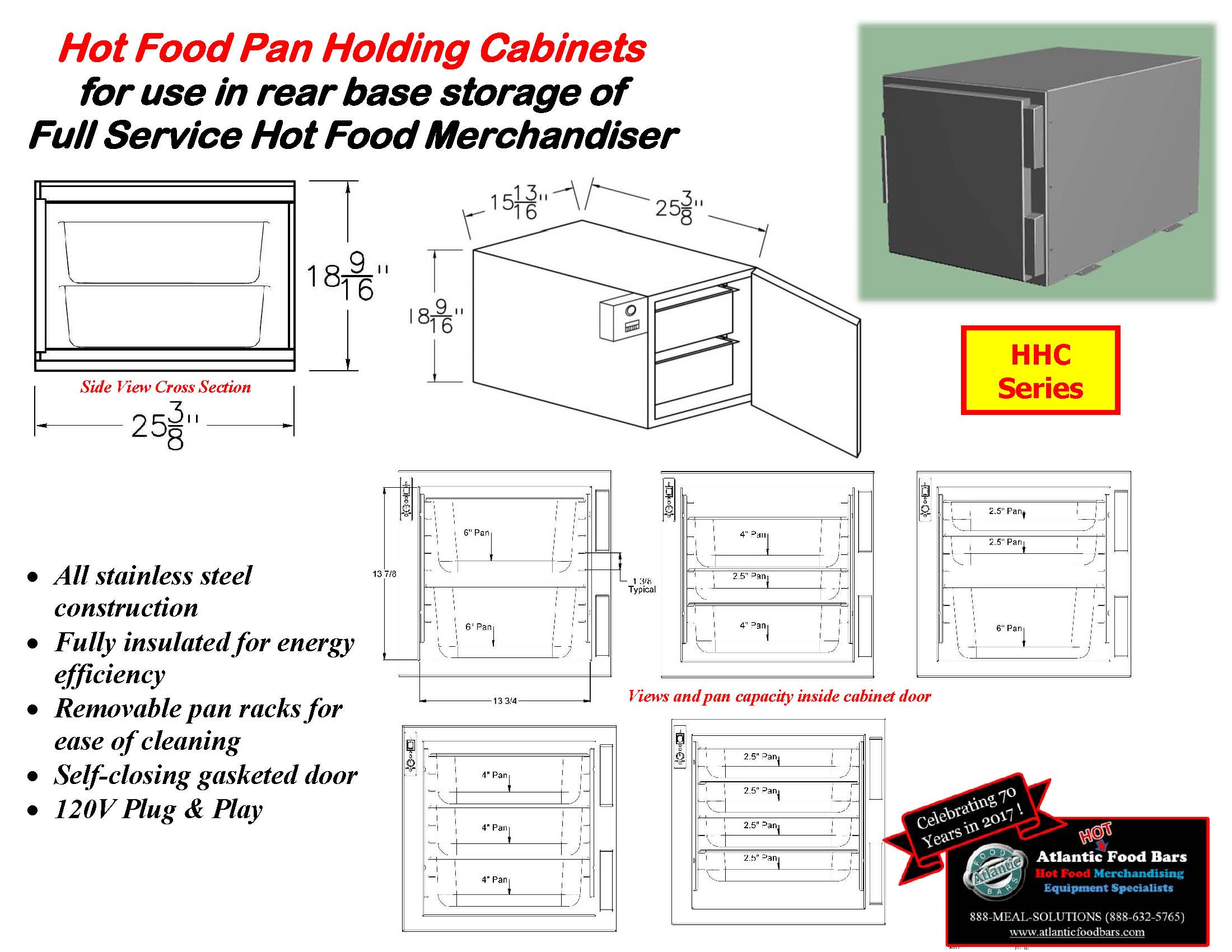 Our HHC Series stainless steel hot food pan holding cabinets fit precisely into the open rear base storage of Atlantic Food Bars hot food merchandisers, reducing your labor needs and ensuring your hot food bars are easily kept full for your customers. No additional floorspace needed to store your ready-to-serve hot prepared foods! These 120V plug & play hot holding cabinets are fully insulated for energy efficiency, and feature a self-closing gasketed door. Pan racks are removable for ease of cleaning.
