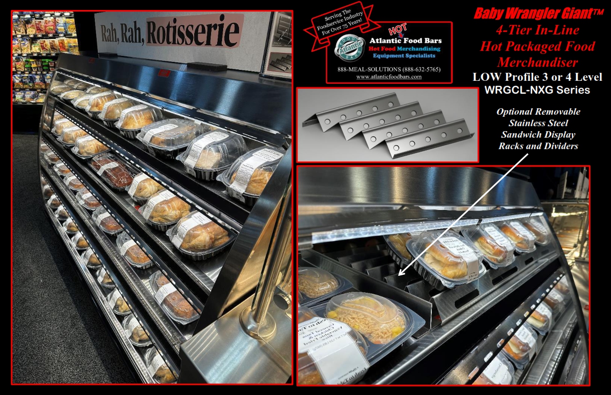 The Atlantic Food Bars WRGCL Series Low Profile Baby Wrangler Giant offers three or four levels of hot chicken and packaged food merchandising. Increase your offering, create more impulse sales, and grow your hot food program. Based upon hourly and daily traffic patterns, you can utilize infinite temperature control for each individual hot deck, controlling shrink, while maximizing merchandising impact. The WRGCL Series is great for end-caps and in-line locations! This multi-level hot grab & go merchandiser is ideal, not just for rotisserie chicken, but for all packaged foods – turn off the heat on any given level to merchandise dry goods. If you are selling hot food FULL service, you won’t believe the profitability of this SELF service unit due to reduced labor costs, convenience for shoppers, higher sales and lower shrink.