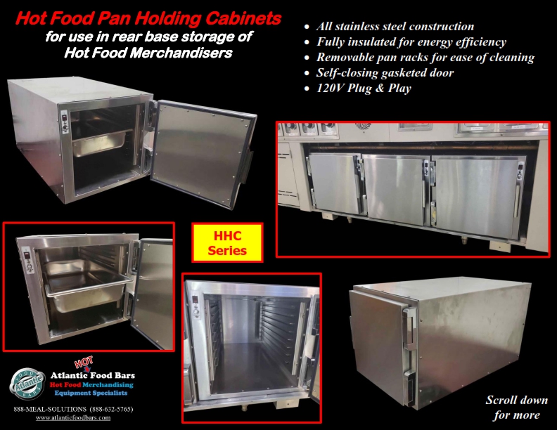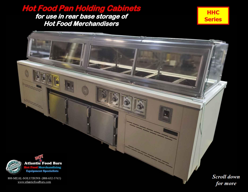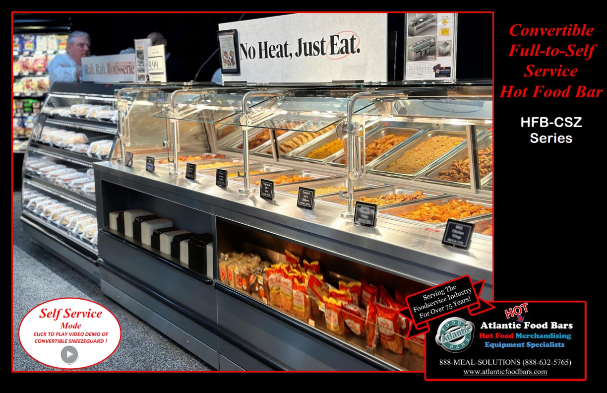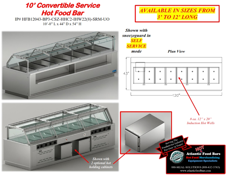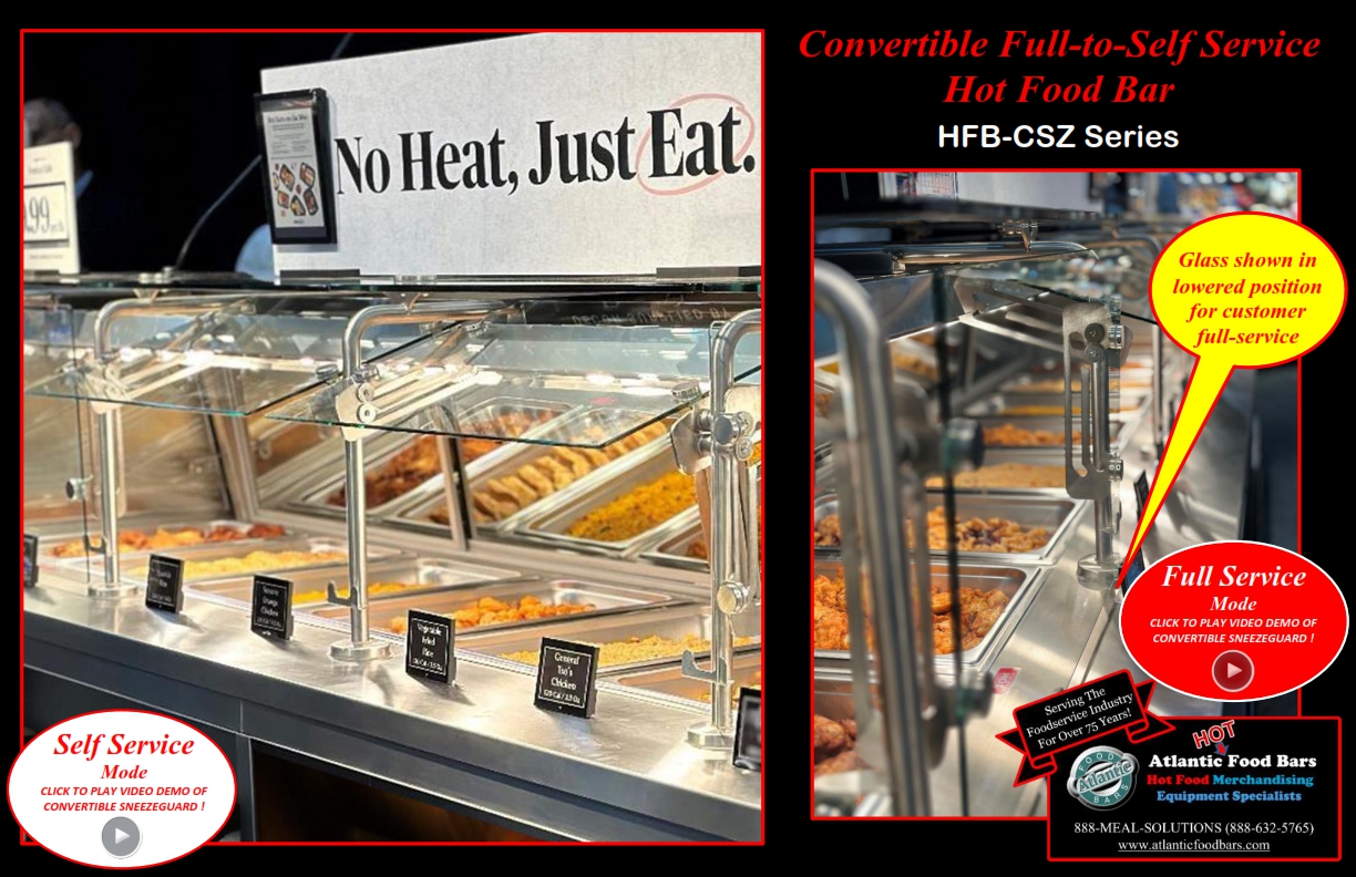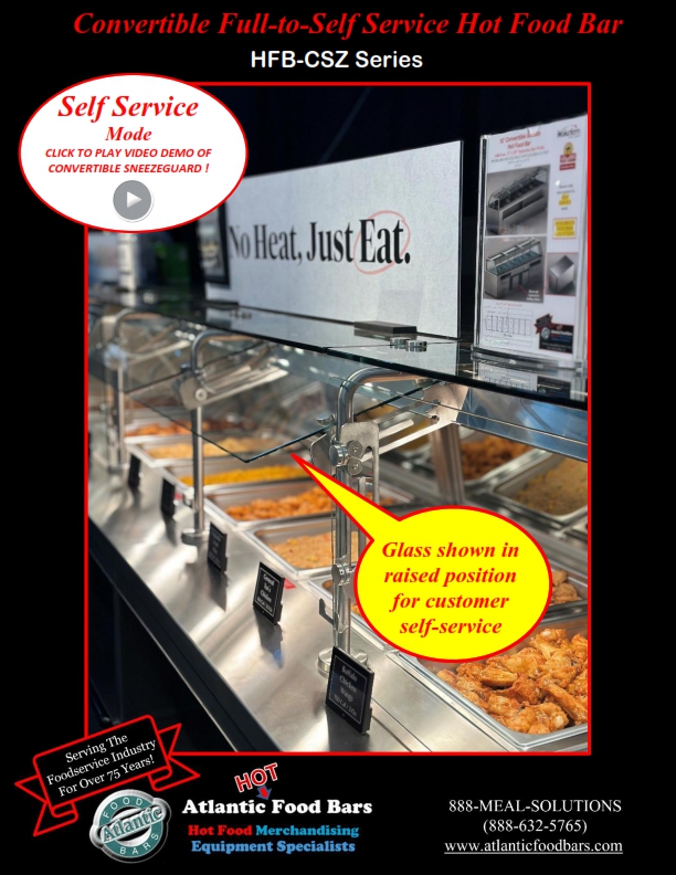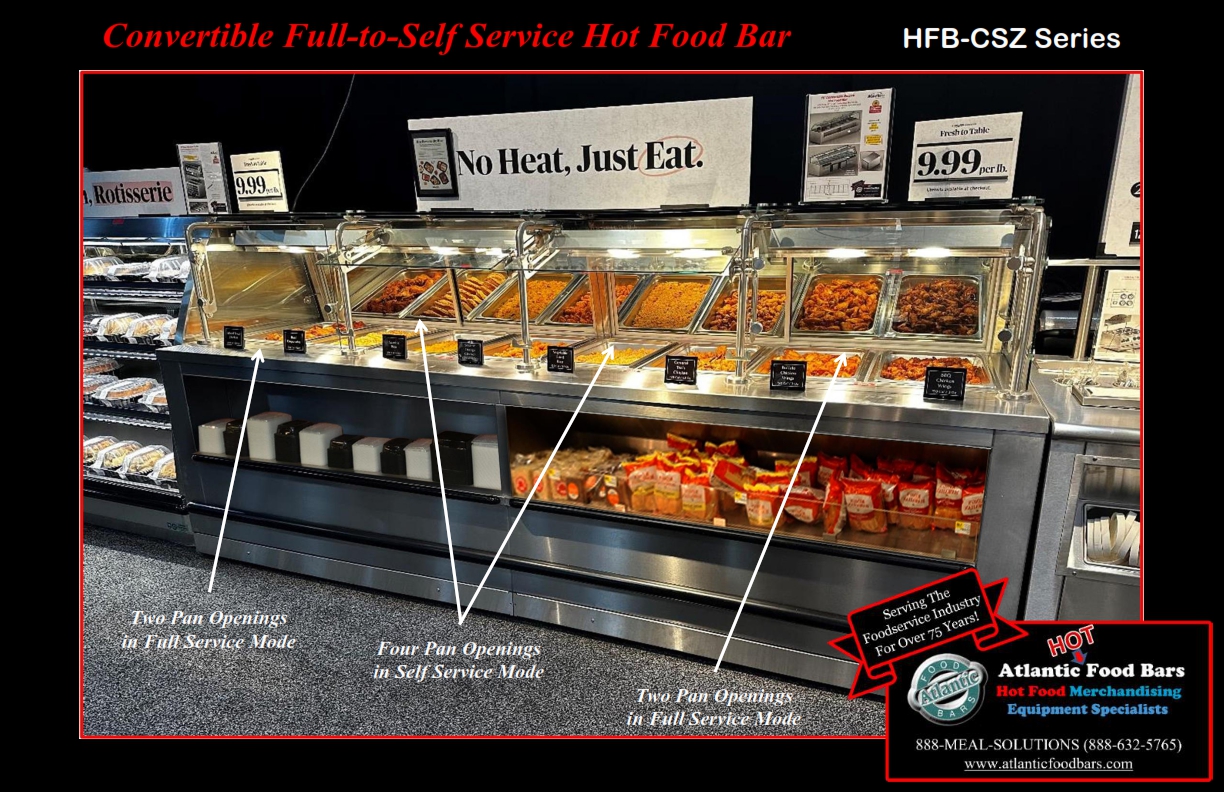 Atlantic Food Bars has the broadest offering of standard and custom self-service in-line and end cap hot food bars – you tell us the size, and we either have a standard model to meet your needs or we will design a hot food bar, to your desired length (to within 1/16”). Custom sizes are no problem! The Atlantic Food Bars HFB-CSZ Series Convertible Service Hot Food Bar allows you to easily switch from self to full service merchandising as desired – no tools required! The glass canopy and convertible sneezeguard are made with scratch resistant tempered glass, and the sneezeguard easily slides under the top for self-service mode. Only Atlantic GUARANTEES temperature maintenance, and our hot food bars keep your food looking fresh and inviting.