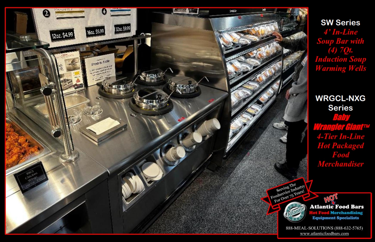 Hot Prepared Foods Lineup featuring Convertible Self to Full Service Hot Food Bar, Self Service Soup Bar and WRGCL Series Baby Wrangler Giant Four Tier In-Line Hot Chicken Merchandiser.