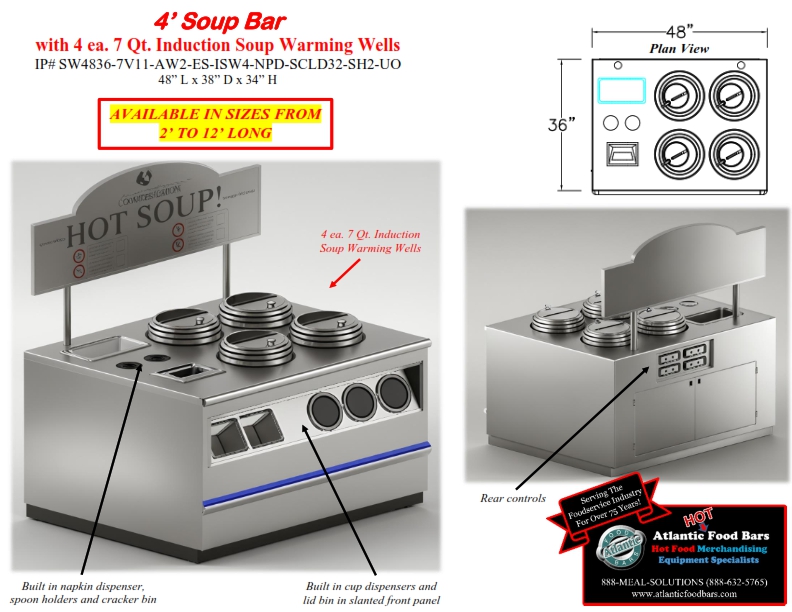 Make your soup offerings a self-service profit center with the Atlantic Food Bars SW Series Soup Bars, with endless features, options & customizations that allow you to build the perfect hot and/or cold merchandiser tailor-made to your foodservice operations! You tell us the size, and we will show you our standard size models or design a soup bar to your desired length (to within 1/16”). Our merchandisers offer standard wet/dry wells, optional autofill wells, or optional magnetic induction warming wells to meet your needs for serviceability and cleaning, while GUARANTEEING temperature maintenance. Our base model includes individual controls on EACH soup well – 7QT or 11QT. Add an optional overhead sign to promote your brand and soups of the day with a large impression that calls out to customers and is visible from across the store. Create an upscale look with an optional solid surface or optional granite countertop. Customize even further with a refrigerated canopy, a stepped refrigerated grab & go end, or a refrigerated cold pan to make this an all-in-one hot and cold merchandiser! Can you say soup & sandwich ? Soup & salad ? Island or single-sided in round, oval, square, hexagonal or rectangular formats. Tight on space? Our Narrow chowder station requires only 18” of depth!