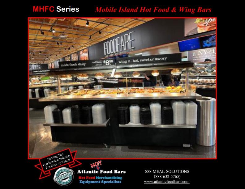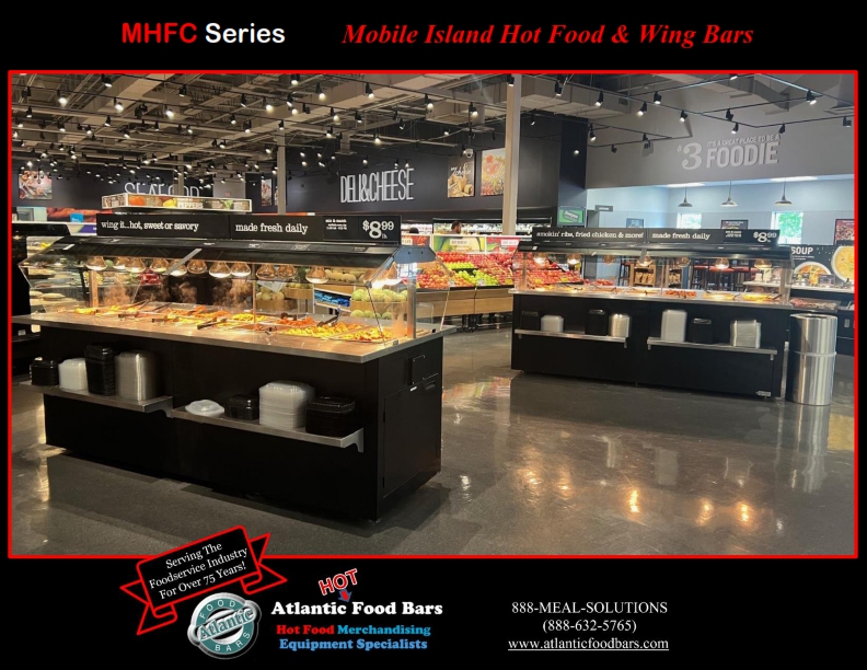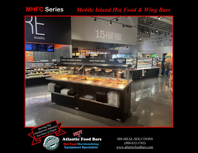 Plug and play mobile convenience, manageable size & affordable cost make the Atlantic Food Bars MHFC Series an ideal vehicle to either start a hot food program, or expand your existing hot food program. Start with one mobile unit and add more as your business grows, or as you add food product categories. Based upon hourly and daily traffic patterns, you can tailor how many units are in use at any one time to maximize merchandising impact, while controlling shrink. If you are happy with your full-service hot food program – add our mobile unit for a specific food category and watch how much more profitable your hot food program becomes. This mobile case is ideal for Hot Wings, Hot Asian Food, Hot Italian Food, Hot Comfort Foods, Hot Vegan and Vegetarian Food, Hot Curry, Hot Breakfast Buffet, Hot Soup, Hot Chili, Hot Stews & More! If you are selling hot food full service, you won’t believe the profitability of this self service unit due to reduced labor costs, convenience for shoppers, higher sales and lower shrink.