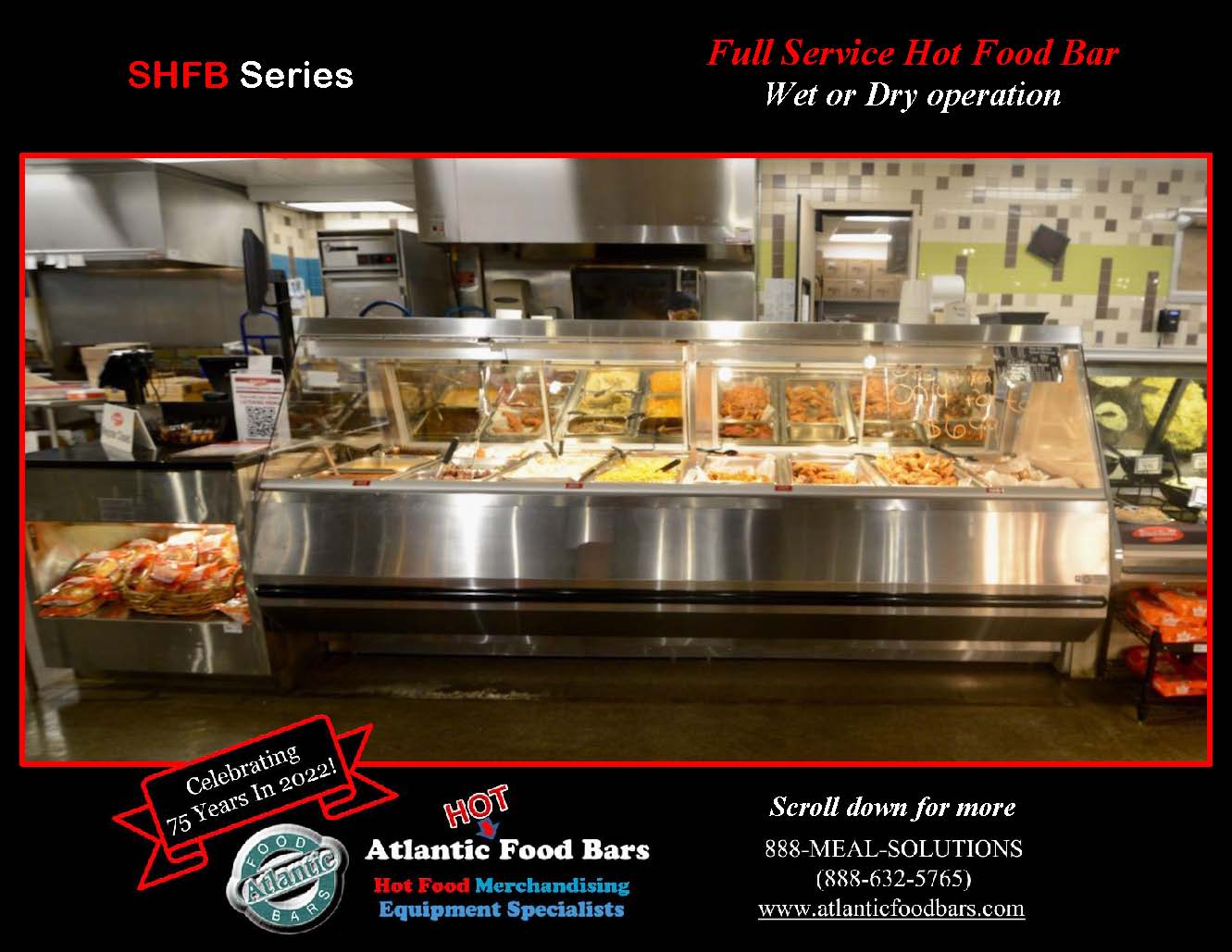 Make your fresh prepared food offerings a full service profit center with the Atlantic Food Bars SHFB Series In-Line Full Service Hot Meal Merchandisers! You tell us the size, and we will show you standard styles or design a custom hot food bar to your desired look and length or profile – no extra charge! The Atlantic Food Bars SHFB Series offers wet or dry heat so your food will stay fresh and maintain critical temperatures. Only Atlantic GUARANTEES temperature maintenance, and our hot food bars keep your food looking fresh and inviting.