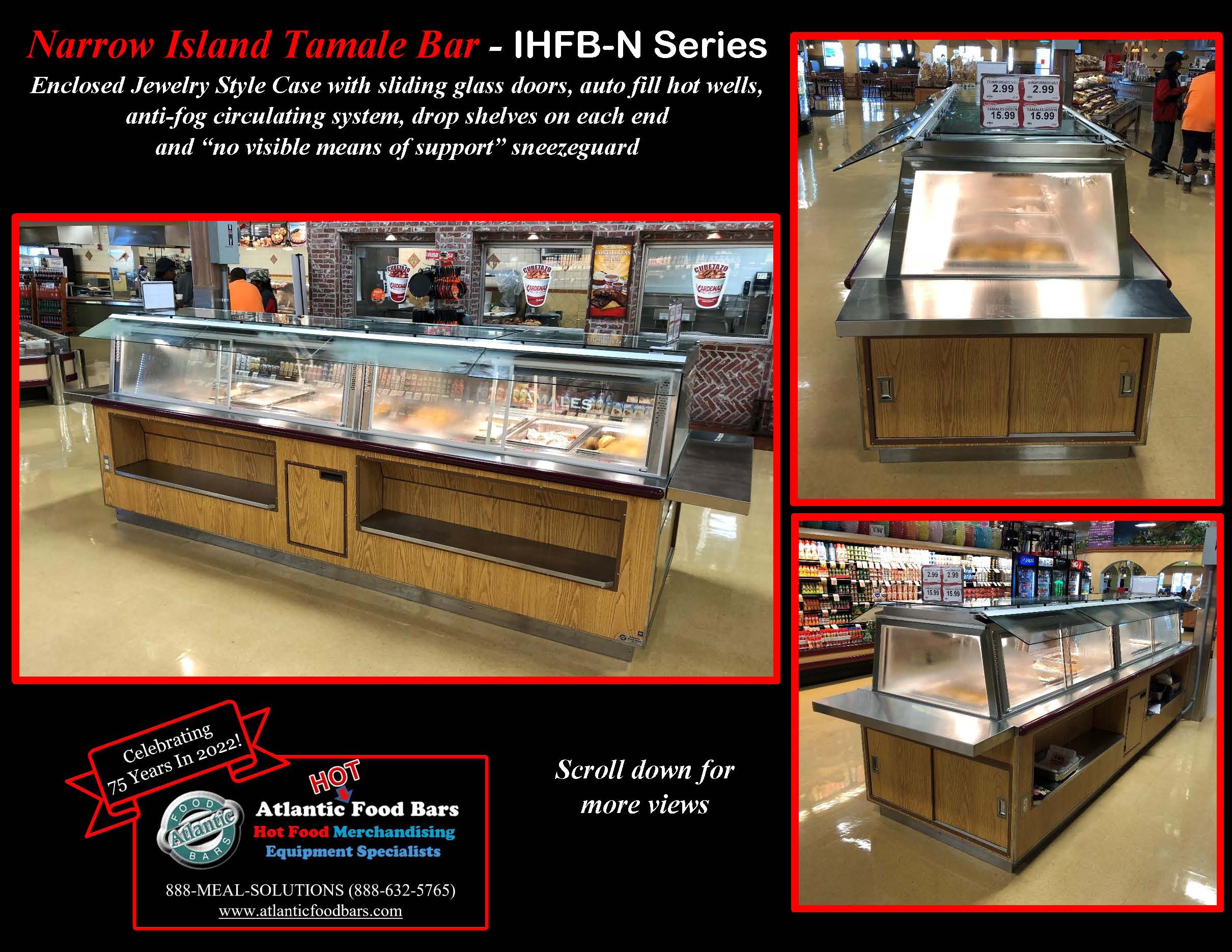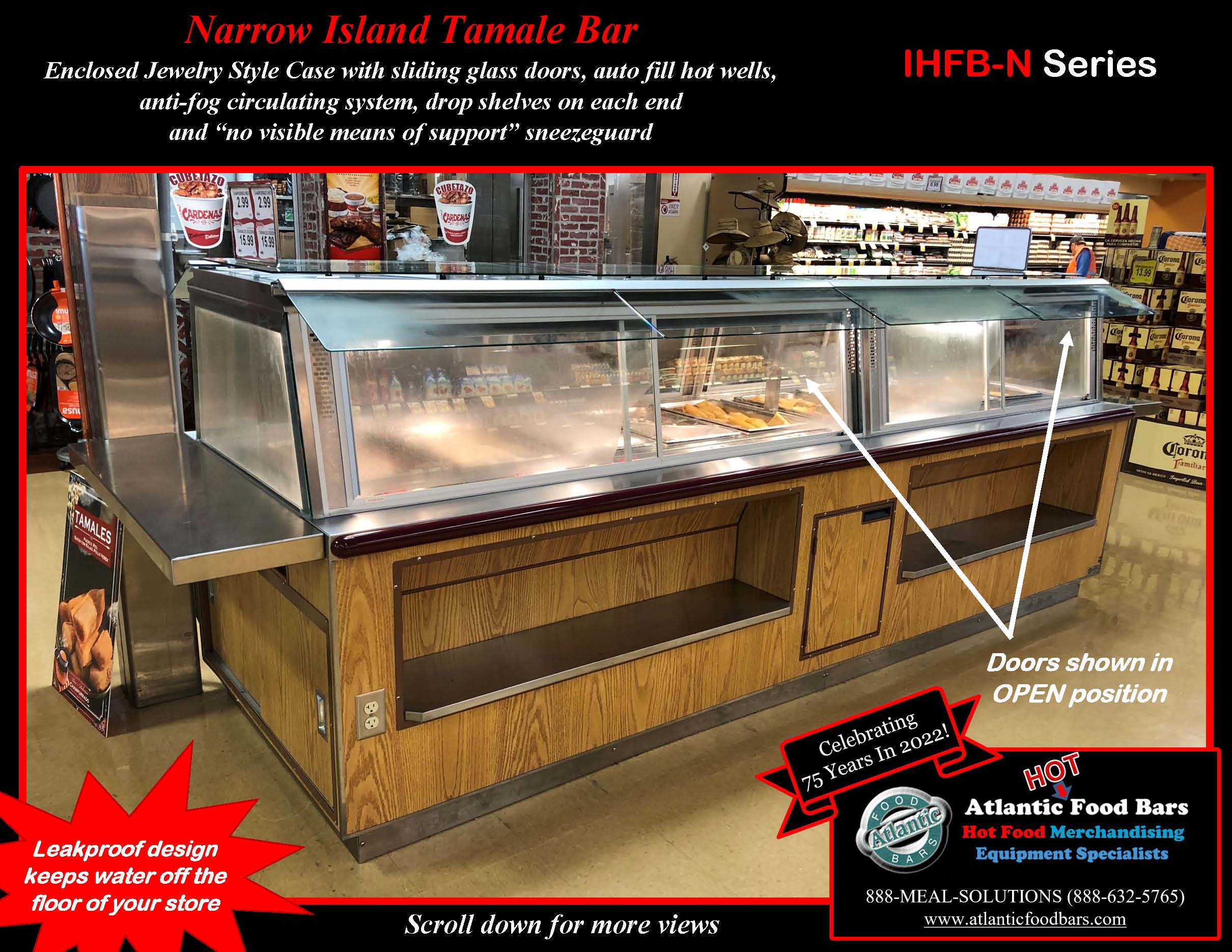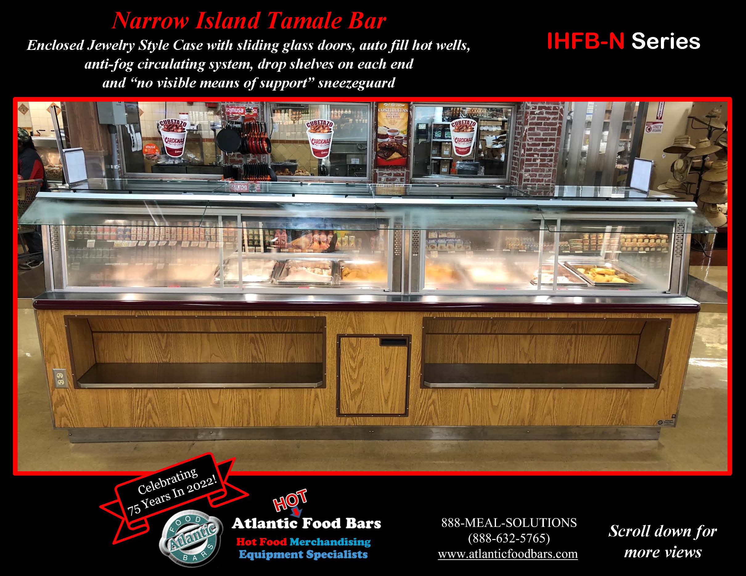 The Atlantic Food Bars IHFB-N Series Narrow Island Hot Tamale Bars start with a basic footprint – you select the size, we will design a hot food bar based upon our innovative heat transfer system that GUARANTEES temperature maintenance, and keeps your food looking fresh and inviting. Perfect for Hispanic markets to easily switch from self-service to full-service merchandising and sell fresh tamales and other hot prepared foods as desired. Our base model includes infinite & individual controls on top of bottom heat of each well, built in container shelf in the body to maximize merchandising in your floor space and tubular sneezeguard design with flip up glass for ease of cleaning and loading. Upgrade the base model with options such as an enclosed jewelry style glass display, autofill wells, an end hot food display with container and condiment station, and our exclusive “No-Visible-Means-Of-Support” Sneezeguard, which offers optimal visibility and convenience – the glass stays up in the position in which you let go. This sneezeguard includes scratch resistant tempered glass with polished edges on the ends, top and sneeze shield.