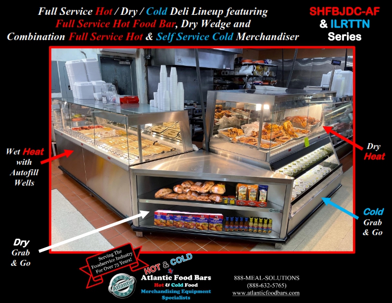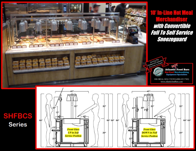 Atlantic Food Bars has the broadest offering of standard and custom self-service in-line and end cap hot food bars – you tell us the size, and we either have a standard model to meet your needs or we will design a hot food bar, to your desired length (to within 1/16”). Custom sizes are no problem! The Atlantic Food Bars HFB-CSZ Series Convertible Service Hot Food Bar allows you to easily switch from self to full service merchandising as desired – no tools required! The glass canopy and convertible sneezeguard are made with scratch resistant tempered glass, and the sneezeguard easily slides under the top for self-service mode. Only Atlantic GUARANTEES temperature maintenance, and our hot food bars keep your food looking fresh and inviting.