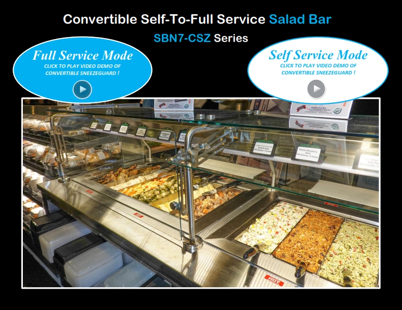 The Atlantic Food Bars SBN7-CSZ Series Convertible Service Refrigerated Salad Bar allows you to easily switch from self to full service merchandising as desired, by hand, in seconds! The sneezeguard easily slides under the top for self-service mode. Featuring our super cold remote NSF7 air overflow design refrigeration system, our SBN7-CSZ Series keeps food fresh and health departments happy. Order with self-contained refrigeration to make it a simple plug & play – no contractor needed. Available in lengths from 48” to 16’ long. Brilliant LED interior lighting and mirrored back panel / doors enhance food display, making it visible from 100 feet away. Convenient shelf in body offers organized space for food containers, utensils and cross merchandising opportunities for snack foods. Makes for an enhanced display that attracts your shoppers’ attention and builds impulse sales.