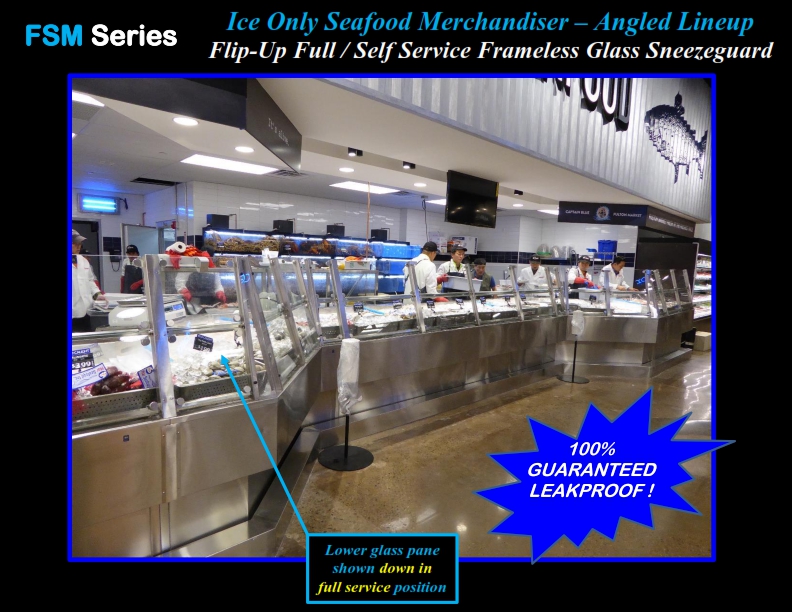 Convert from self service to full service and back based upon time of day, special menu items, promos and other occasions when you need a choice. Individual sections are convertible, so your merchandising can be split into part full service and part self service. Our food bars can be built with different convertible sneezeguard styles – including rotating, sliding and flip-up glass. It’s not just for hot and cold food bars – convertible sneezeguards transform seafood display cases into versatile merchandisers.