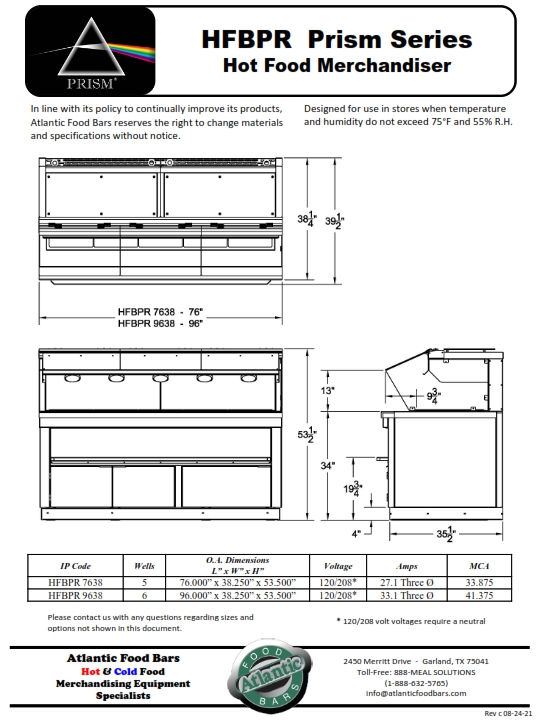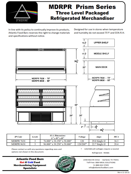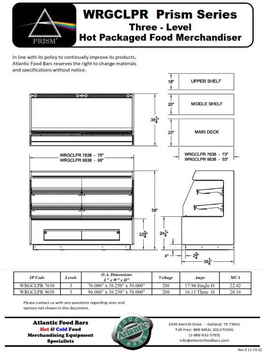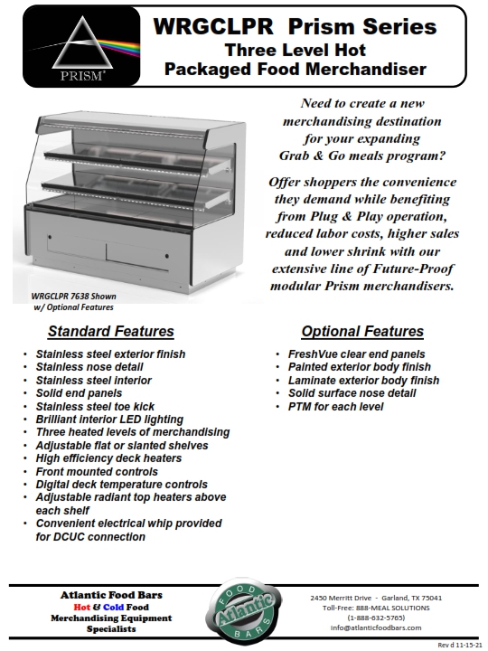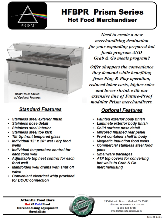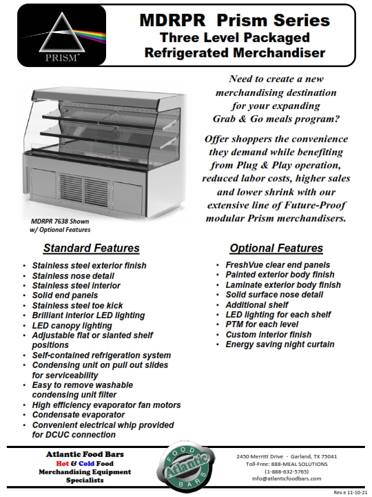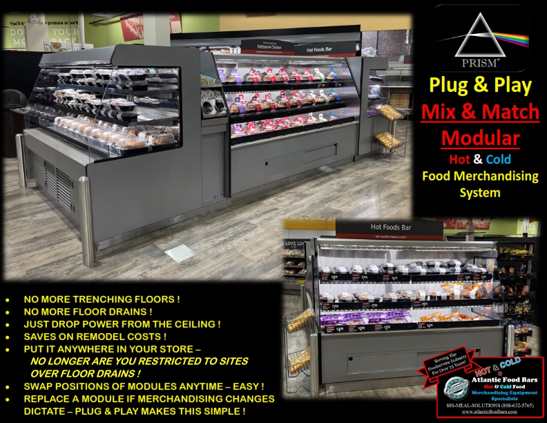 Create a new merchandising destination and profit center with the Atlantic Food Bars Prism Series! Offer shoppers the convenience and variety they demand, while improving store operations with plug & play self-contained design, merchandising flexibility, reduced labor costs, higher sales and lower shrink. This extensive line of future-proof modular mix & match food merchandising cases can be configured in any way you desire. Reconfigure at any time, or move individual cases to a different location in your store – Prism Series merchandisers are designed with finished backs and sides so that each case can be used independently of the island configuration. No more trenching floors and no more floor drains! Just drop power from the ceiling. Save on remodel costs – put anywhere in your store – no longer are you restricted to sites over floor drains! Simple plug & play design makes it easy to swap positions of modules anytime or replace a module if merchandising changes dictate.