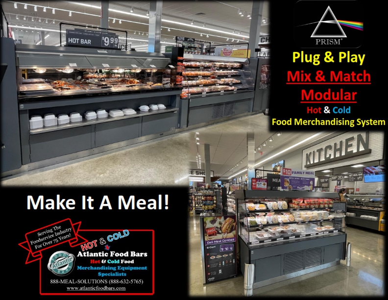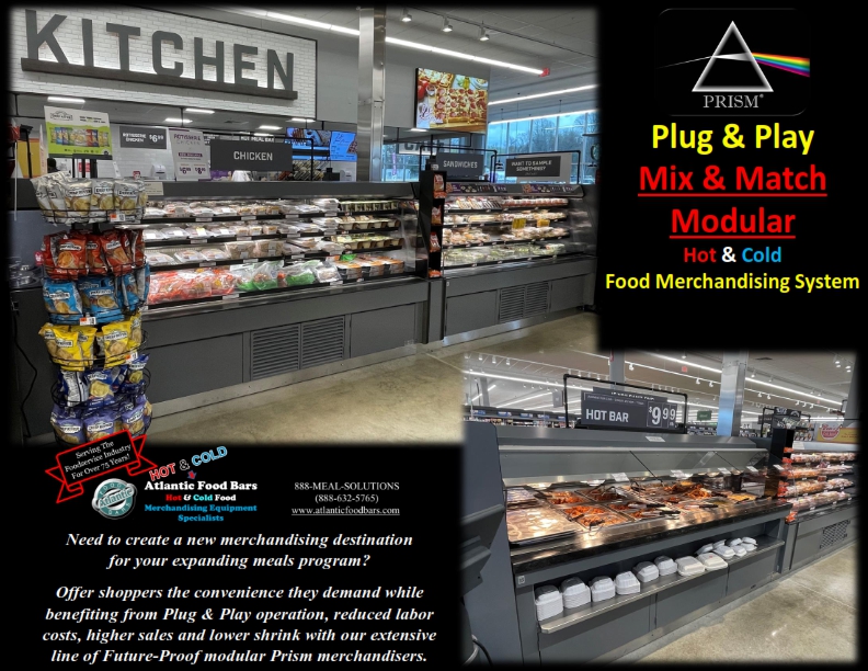 Create a new merchandising destination and profit center with the Atlantic Food Bars Prism Series! Offer shoppers the convenience and variety they demand, while improving store operations with plug & play self-contained design, merchandising flexibility, reduced labor costs, higher sales and lower shrink. This extensive line of future-proof modular mix & match food merchandising cases can be configured in any way you desire. Reconfigure at any time, or move individual cases to a different location in your store – Prism Series merchandisers are designed with finished backs and sides so that each case can be used independently of the island configuration. No more trenching floors and no more floor drains! Just drop power from the ceiling. Save on remodel costs – put anywhere in your store – no longer are you restricted to sites over floor drains! Simple plug & play design makes it easy to swap positions of modules anytime or replace a module if merchandising changes dictate.