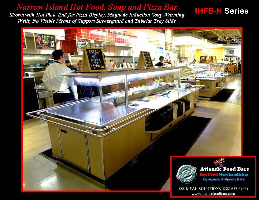 Narrow Island Pizza, Soup and Hot Food Bar – Shown with Tubular Tray Slide and Induction Soup Warming Wells – IHFBN-SB-HP-TS-VH