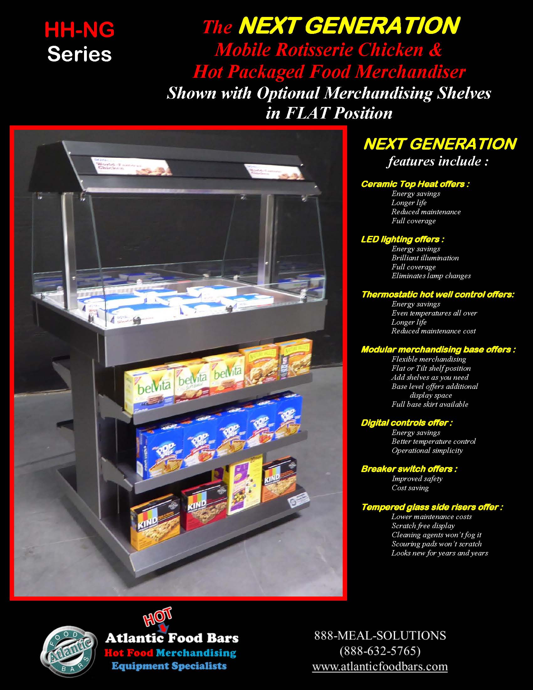 Next Generation Mobile Rotisserie Chicken & Hot Packaged Food Merchandiser Featuring Energy-Efficient Ceramic Top Heat with Brilliant LED Lighting, Digital Controls, Thermostatic Hot Well Control & Modular Merchandising Base with Flat/Tilted Shelves – HH-NG Series