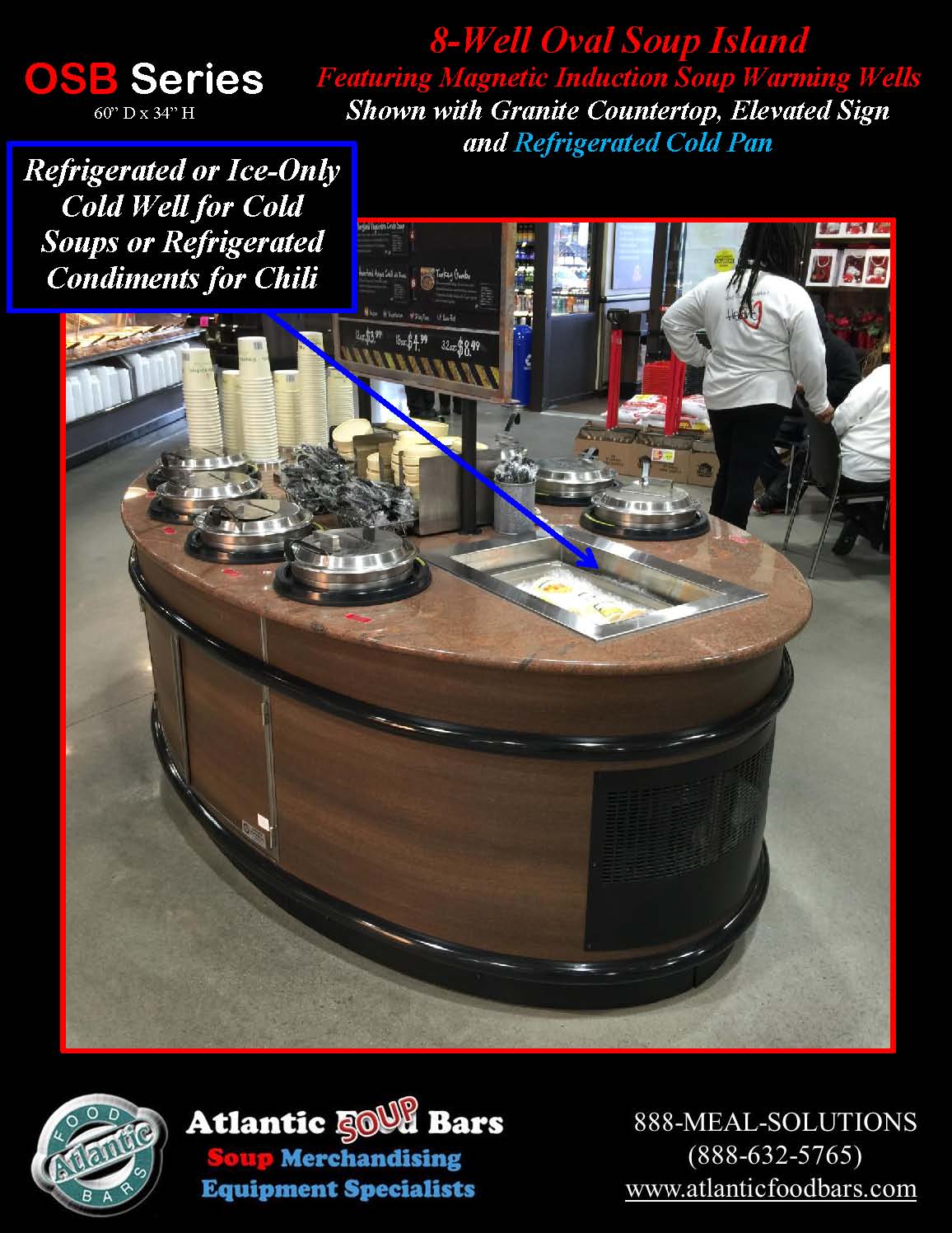 Oval Hot Soup Merchandiser featuring Refrigerated Cold Pan for Selling Packaged Soup or Chili Condiments – shown with Granite Countertop and Magnetic Induction Warming Wells for Critical Temperature Maintenance ! – OSB9246-GC-ISW-LB-RCP