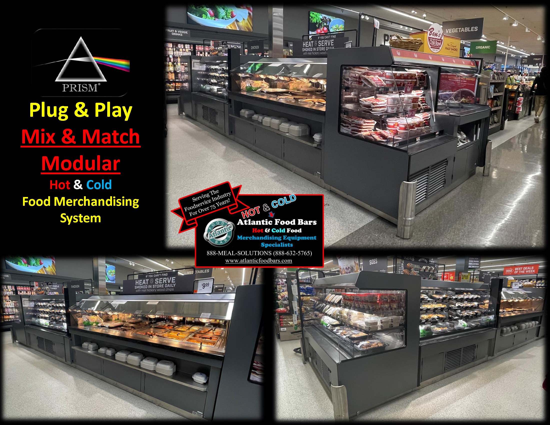 Create a new merchandising destination and profit center with the Atlantic Food Bars Prism Series! Offer shoppers the convenience and variety they demand, while improving store operations with plug & play self-contained design, merchandising flexibility, reduced labor costs, higher sales and lower shrink. This extensive line of future-proof modular mix & match food merchandising cases can be configured in any way you desire. Reconfigure at any time, or move individual cases to a different location in your store – Prism Series merchandisers are designed with finished backs and sides so that each case can be used independently of the island configuration. No more trenching floors and no more floor drains! Just drop power from the ceiling. Save on remodel costs – put anywhere in your store – no longer are you restricted to sites over floor drains! Simple plug & play design makes it easy to swap positions of modules anytime or replace a module if merchandising changes dictate.