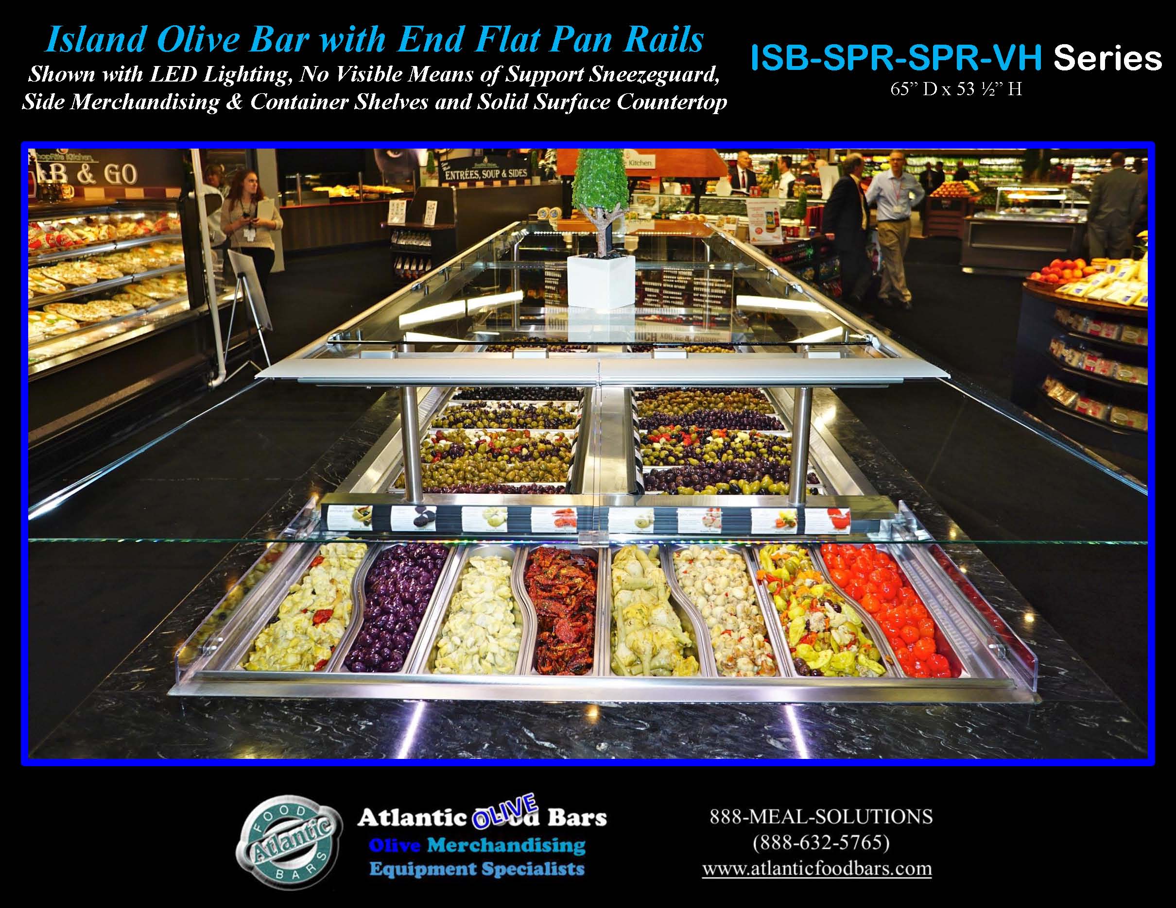 Refrigerated Island Olive Bar with Flat Pan Rails – featuring LED Lighting and Solid Surface Countertop – ISB14863-SPR-SPR-SSC-VH