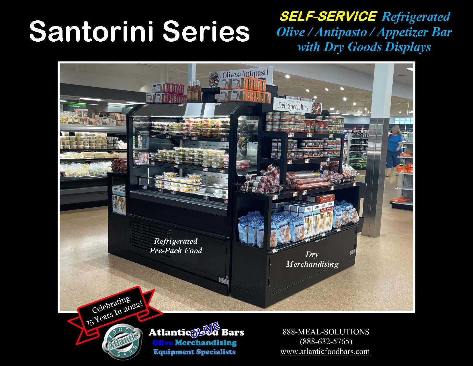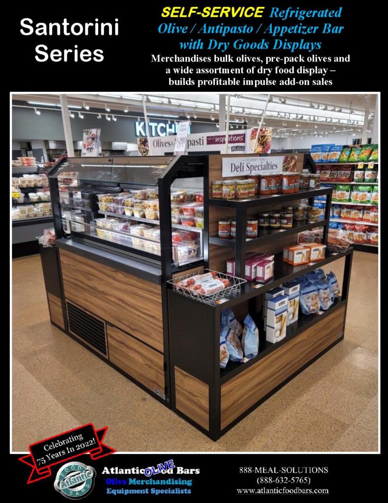 Self Service Refrigerated Bulk and Packaged Olive / Antipasto / Appetizer Bar – Island with Dry Goods Displays – Santorini Series