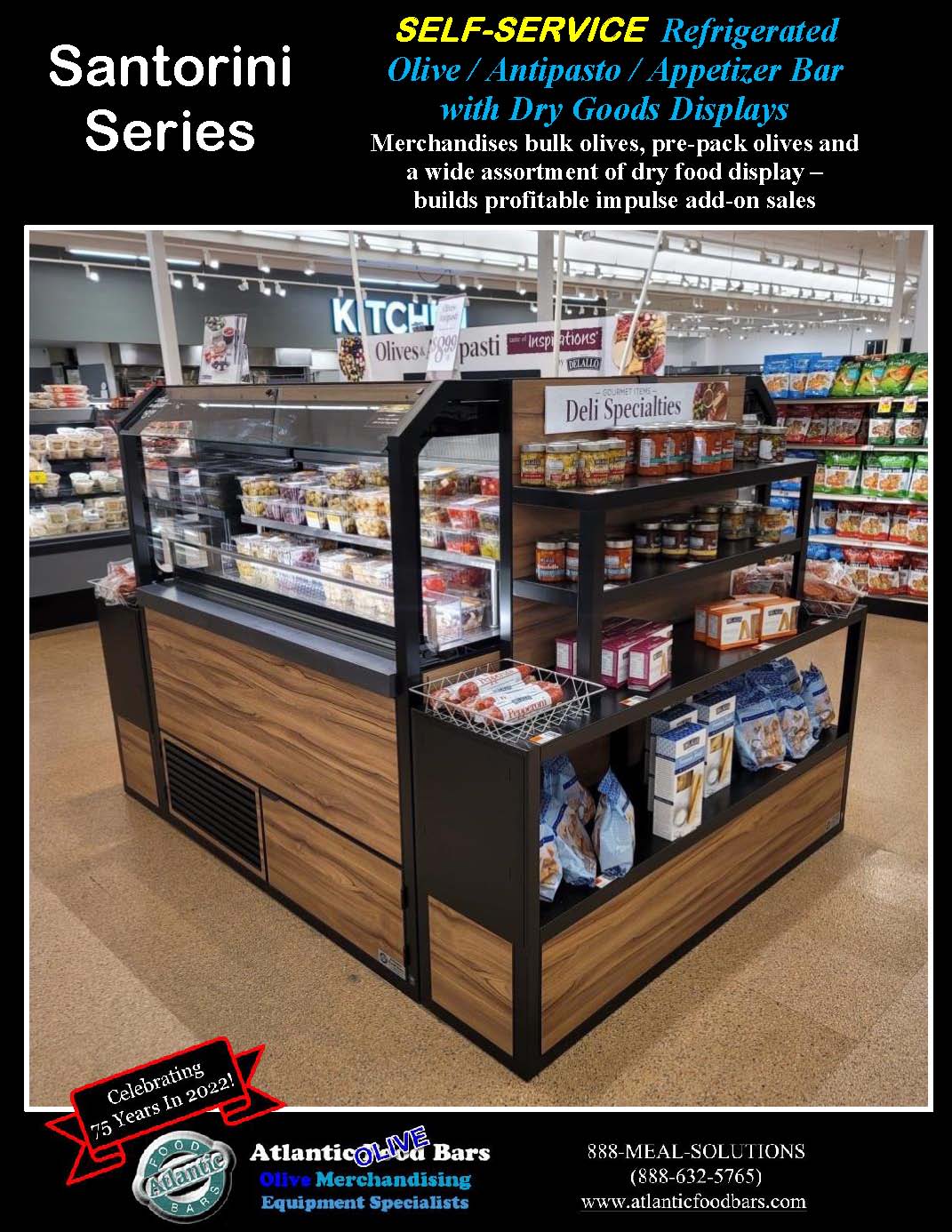 If you can imagine it, we can build it! Atlantic Food Bars Olive Bars are available in countless standard and custom configurations. Create more impulse sales and grow your food merchandising programs with displays that guarantee temperature maintenance. For over 75 years, we have worked with our customers to create imaginative cross merchandising opportunities and get the most out of a singular footprint. Maximize your merchandising impact with a standard or custom shop-around case designed to your exact specs. If you are selling food full service, you won’t believe the profitability of these self service units due to reduced labor costs, convenience for shoppers, higher sales and lower shrink.