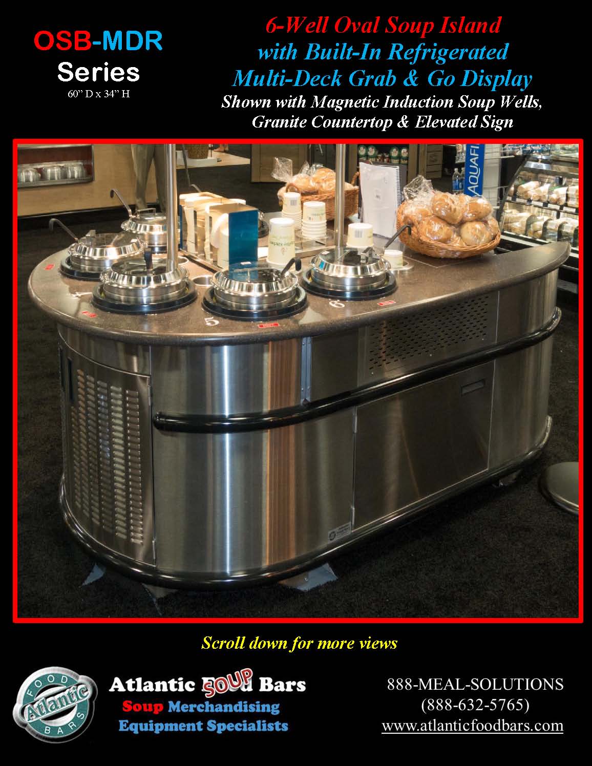 Soup Bar in Oval Format with Built-In Refrigerated Grab & Go Multi-Deck Display for Salads or Cold Soups – shown with Induction Soup Wells, Granite Countertop & Elevated Sign – OSB-GC-ISW6-MDR